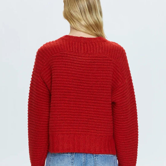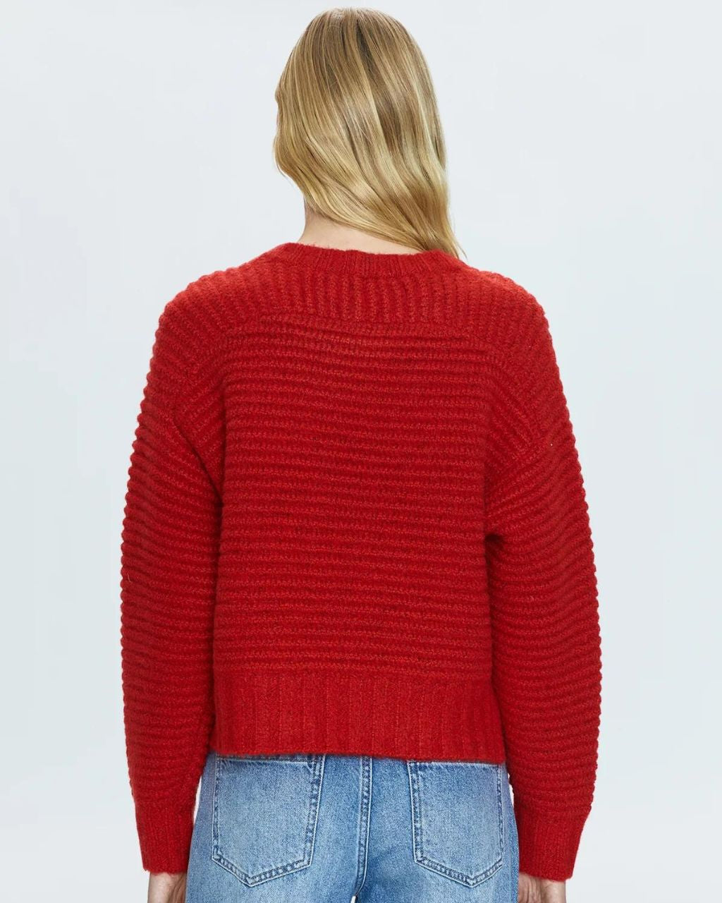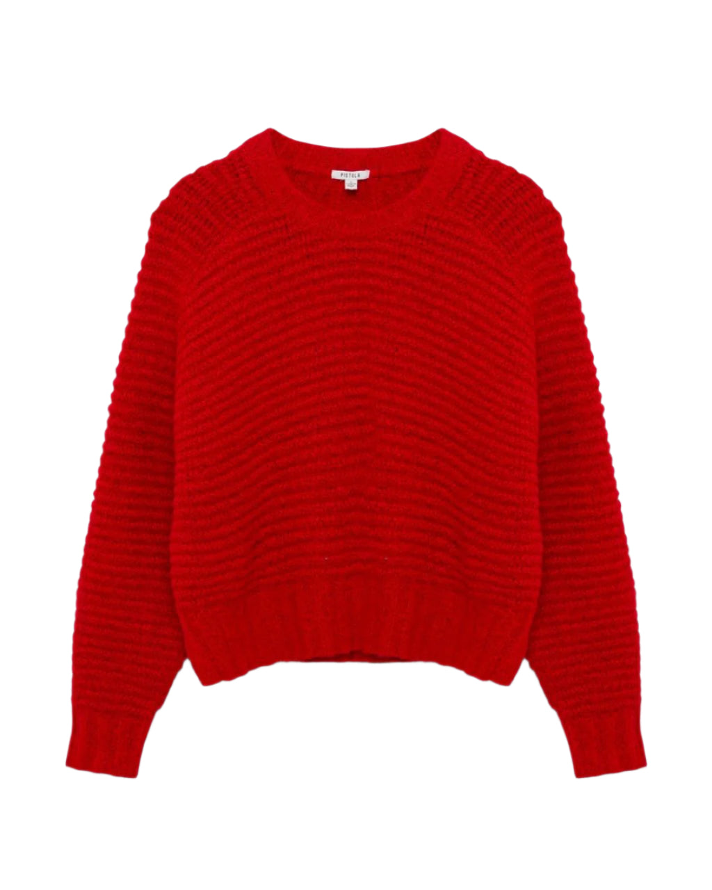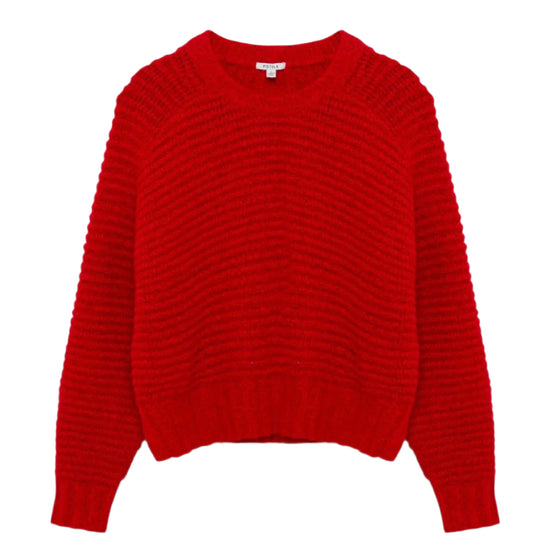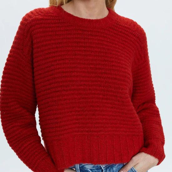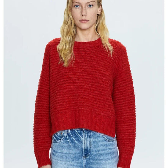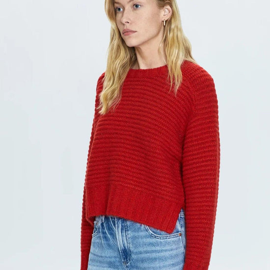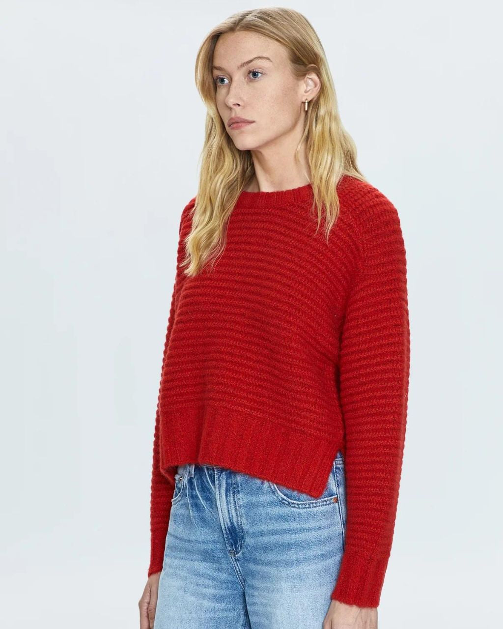 Medium weight, waffle knit sweater. Raglan, long sleeves with monochromatic rib trim at neckline, sleeves, and hem. Designed with an elongated crop proportion and split hem that grazes the waistband. Rouge is a bright, cherry red for of-the-moment statement styling.