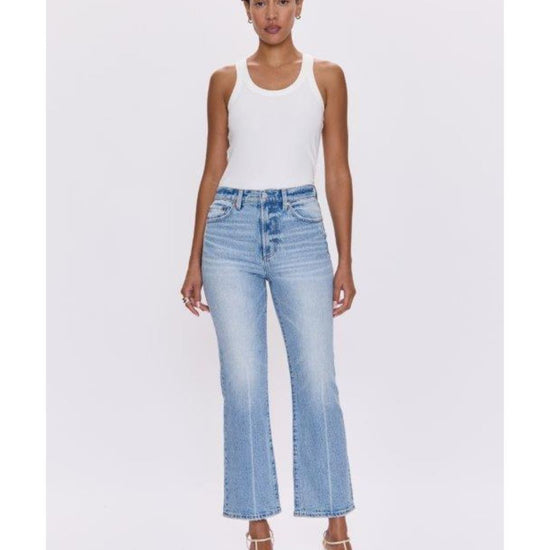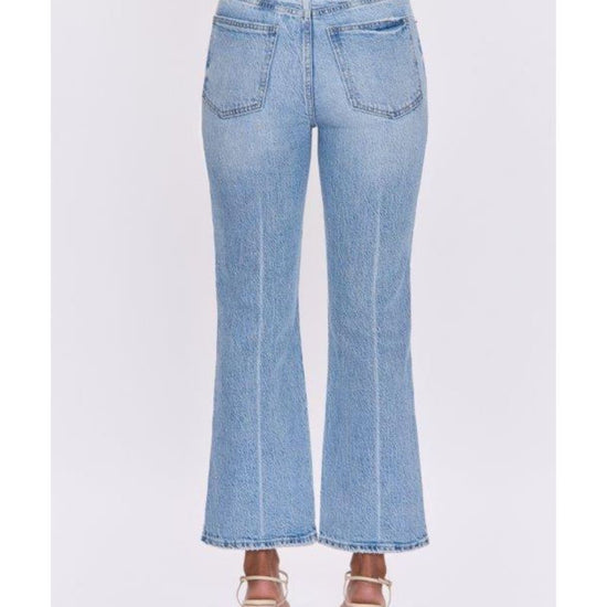 Close to everything. A bootcut designed to imitate your favorite pair of vintages. Crafted from our signature comfort stretch denim with a slightly wider leg, more relaxed fit, and super-high rise waist. Featuring a cropped, ankle length hem with a clean finish
