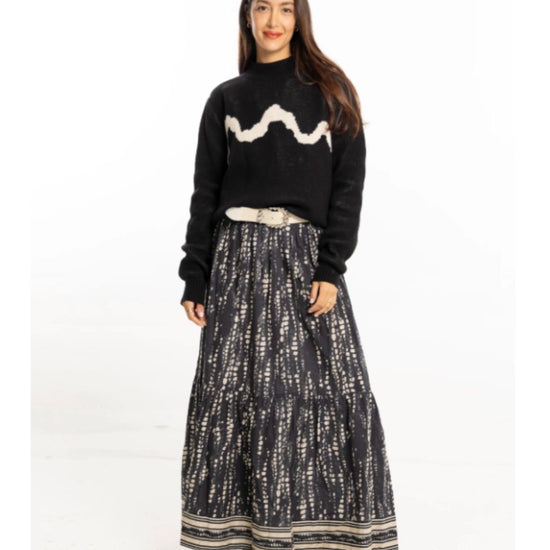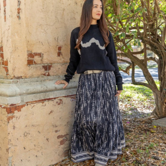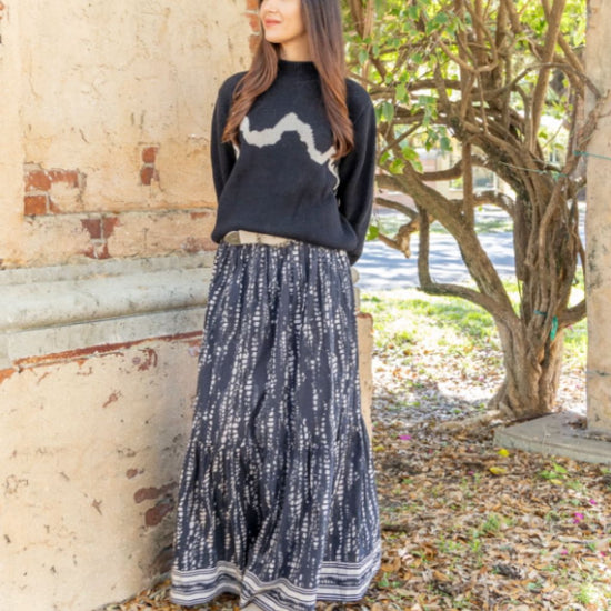The Ariana Skirt in Black Pearl flows with timeless elegance in a simple, flattering silhouette. Crafted from pure cotton and adorned with our signature Black Pearl print, it trails softly along its tiered length for graceful movement. A gathered elastic waistband ensures an easy, comfortable fit. Style it with the matching top for a coordinated statement look, or pair it with cozy knits and boots for effortless everyday charm.