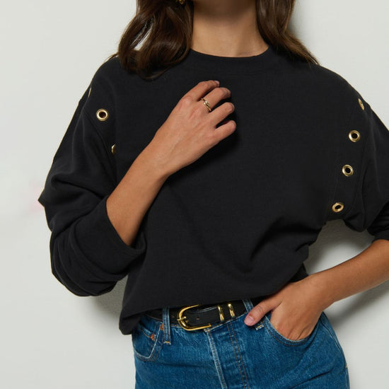 A cozy crew neck sweatshirt, but make it Nation. Drop shoulders, contrast ribbing at the neckline, plus gold grommet details at the shoulder for some added flair what's not to love?This one comes in Jet Black.