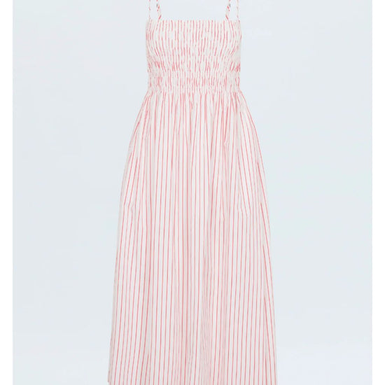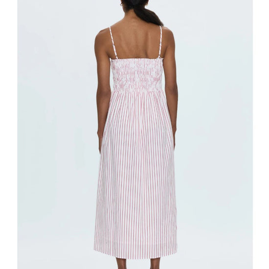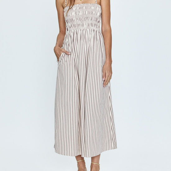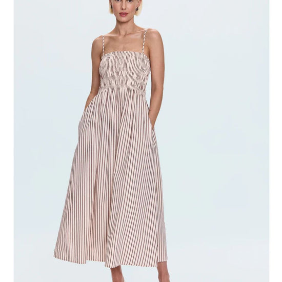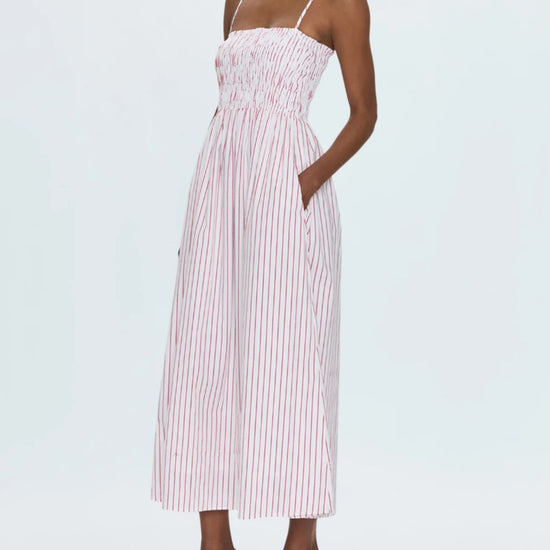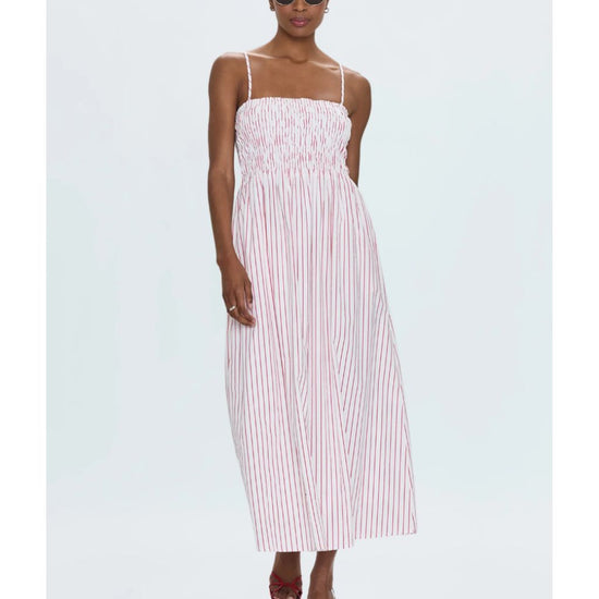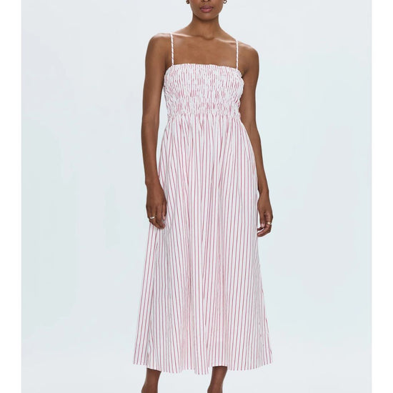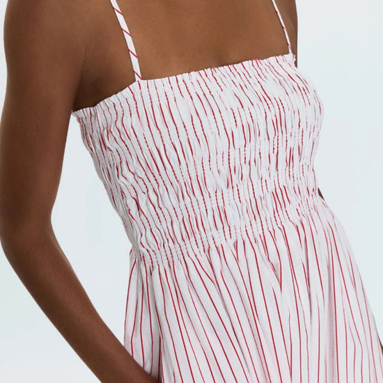 Sweet treat. Breezy day dress crafted from a flowing, lightweight fabrication designed for warm weather wear. Smocked bodice with ruched design details, topped with adjustable shoulder straps.