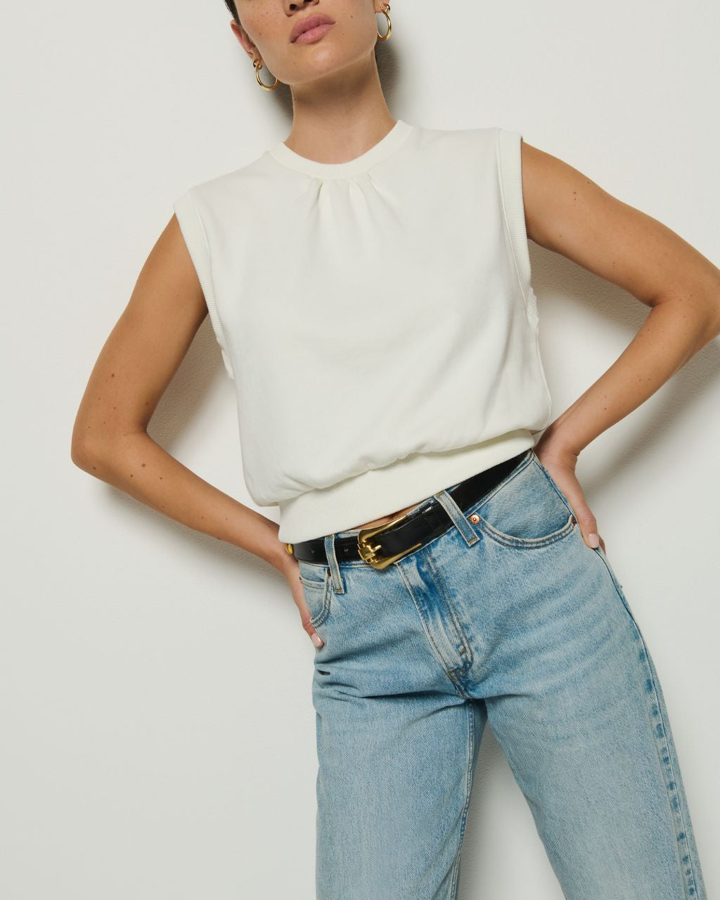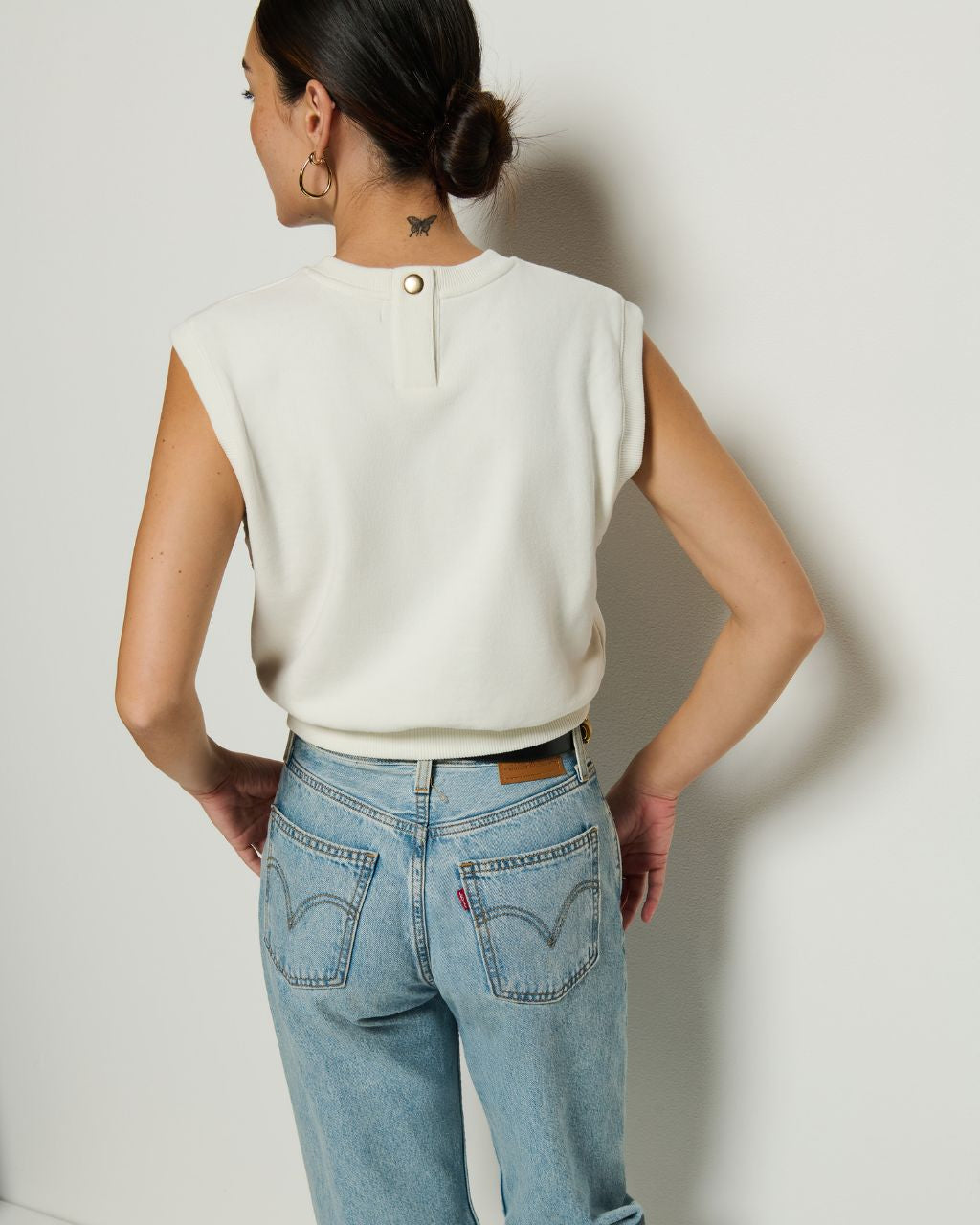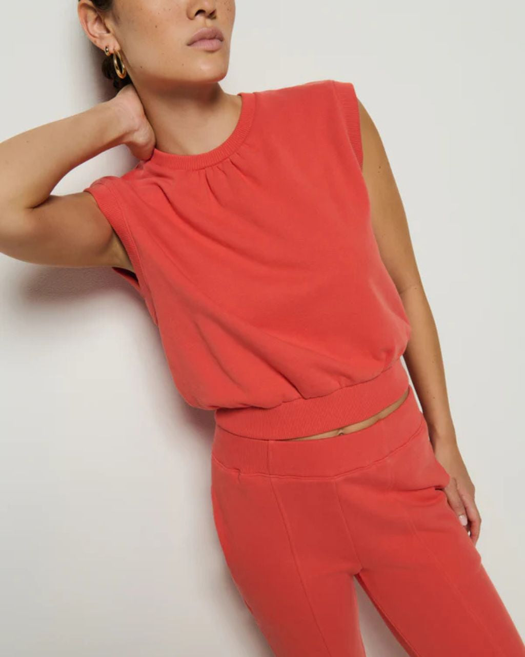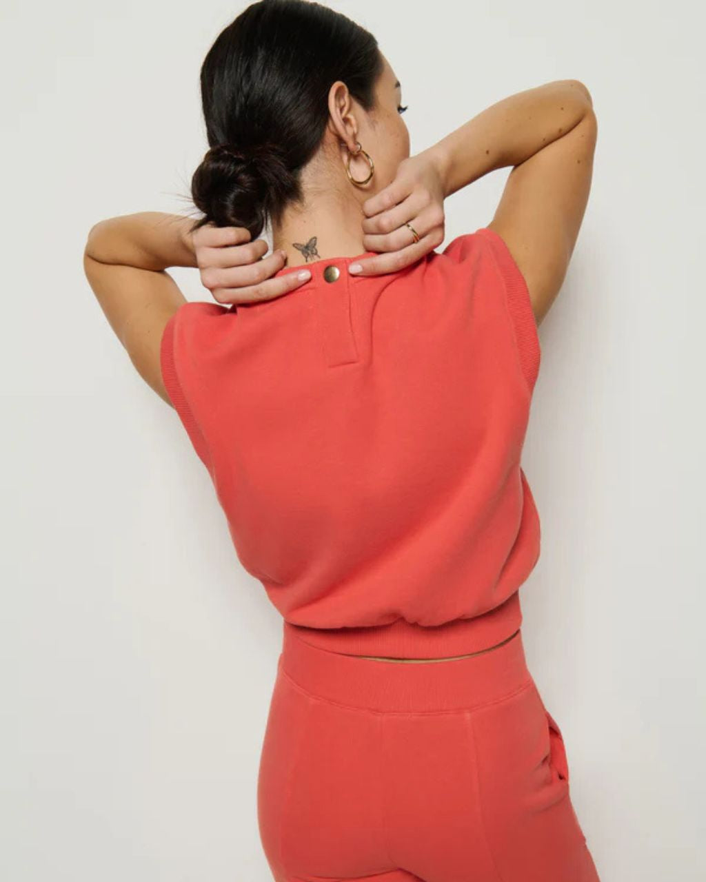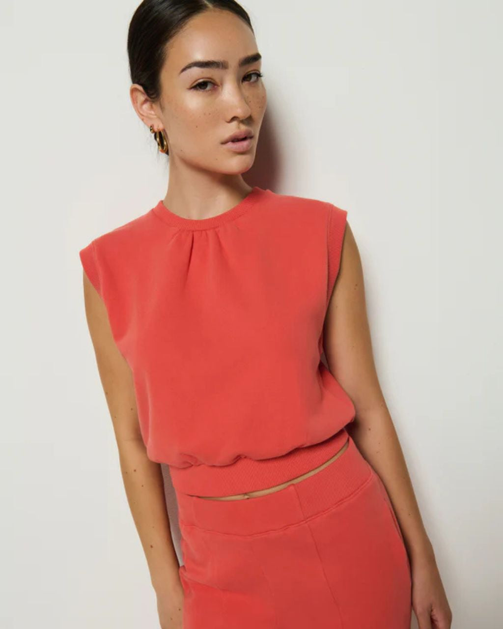 A sleeveless sweatshirt, but make it Nation. Contrast ribbing at the neck and armholes with a cropped, controlled hem, shirring at the neckline for a feminine touch, and of course one of our signature gold buttons at the back. Style tip: pair with your favorite denim or make it a set with our Reece Sweatpant. This one comes in Coral Kiss and Porcelain.