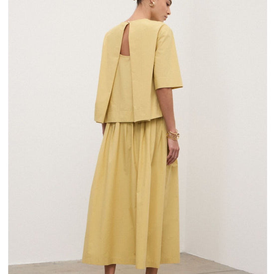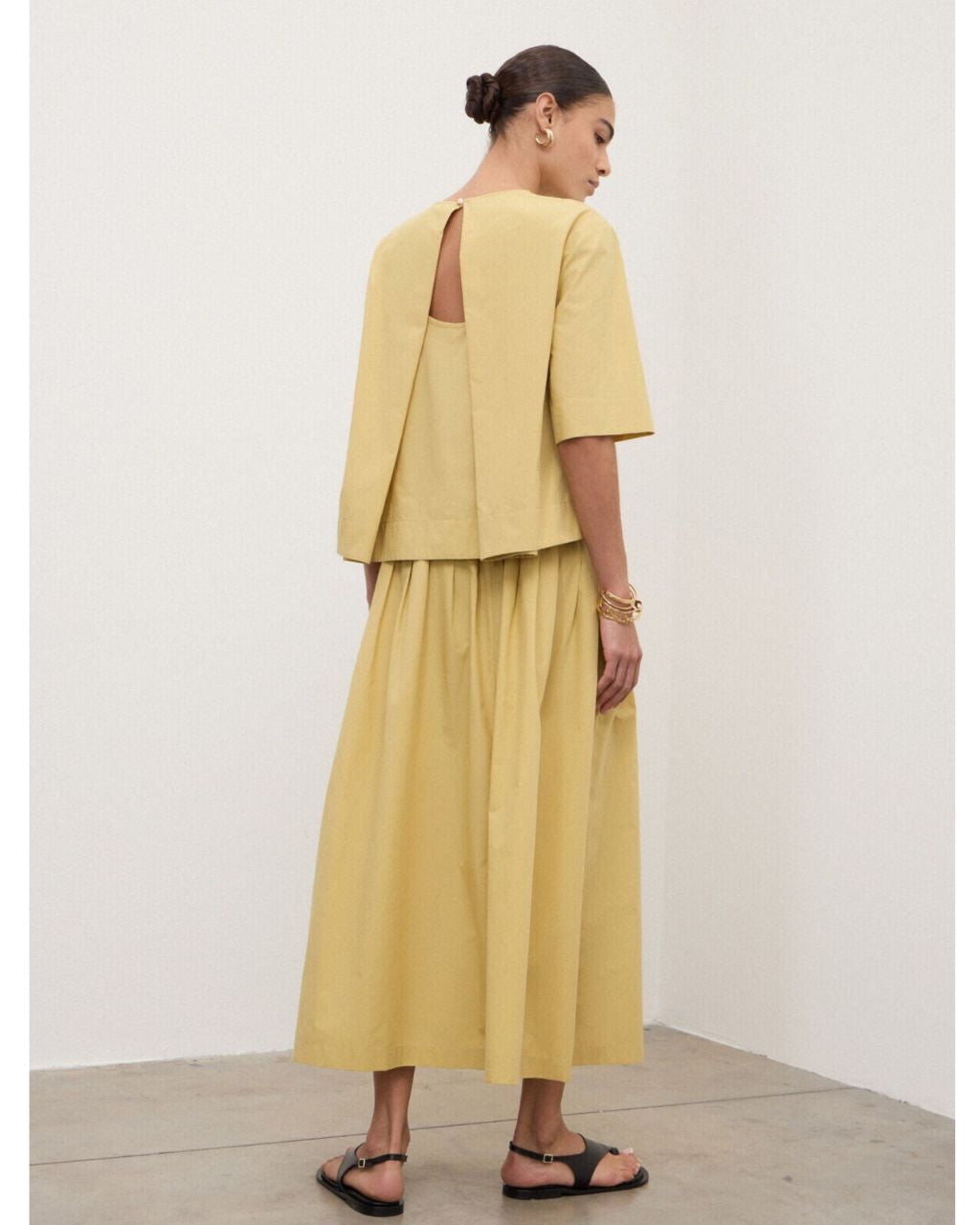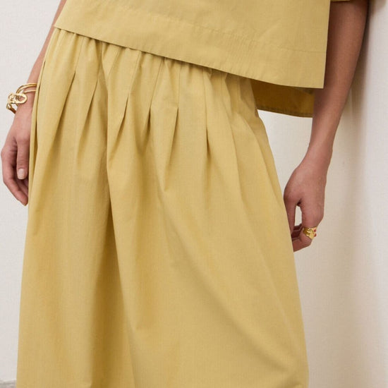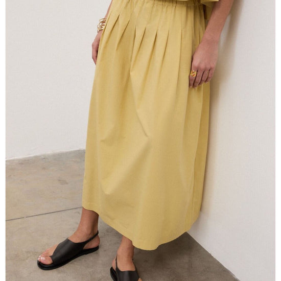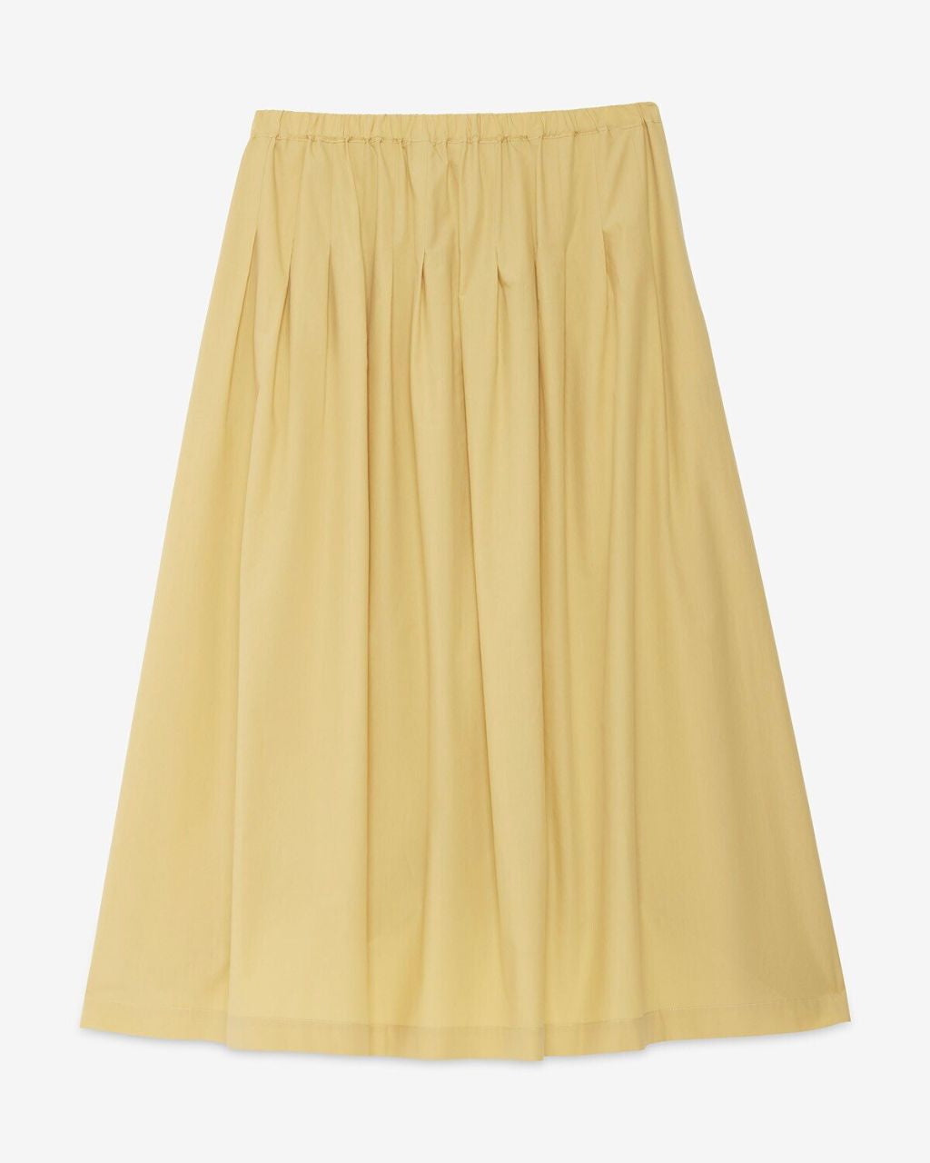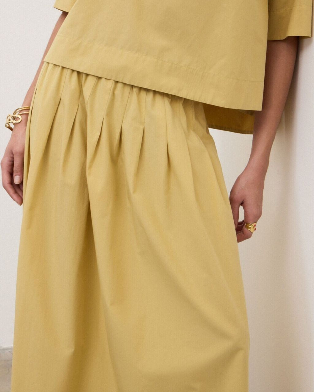 Pleated cotton poplin skirt with an elastic waist, designed to combine structure and lightness. Regular pleats define the volume and give rhythm to the silhouette, maintaining a clean aesthetic. A versatile piece, ideal for interpreting everyday wear with simple, contemporary elegance.