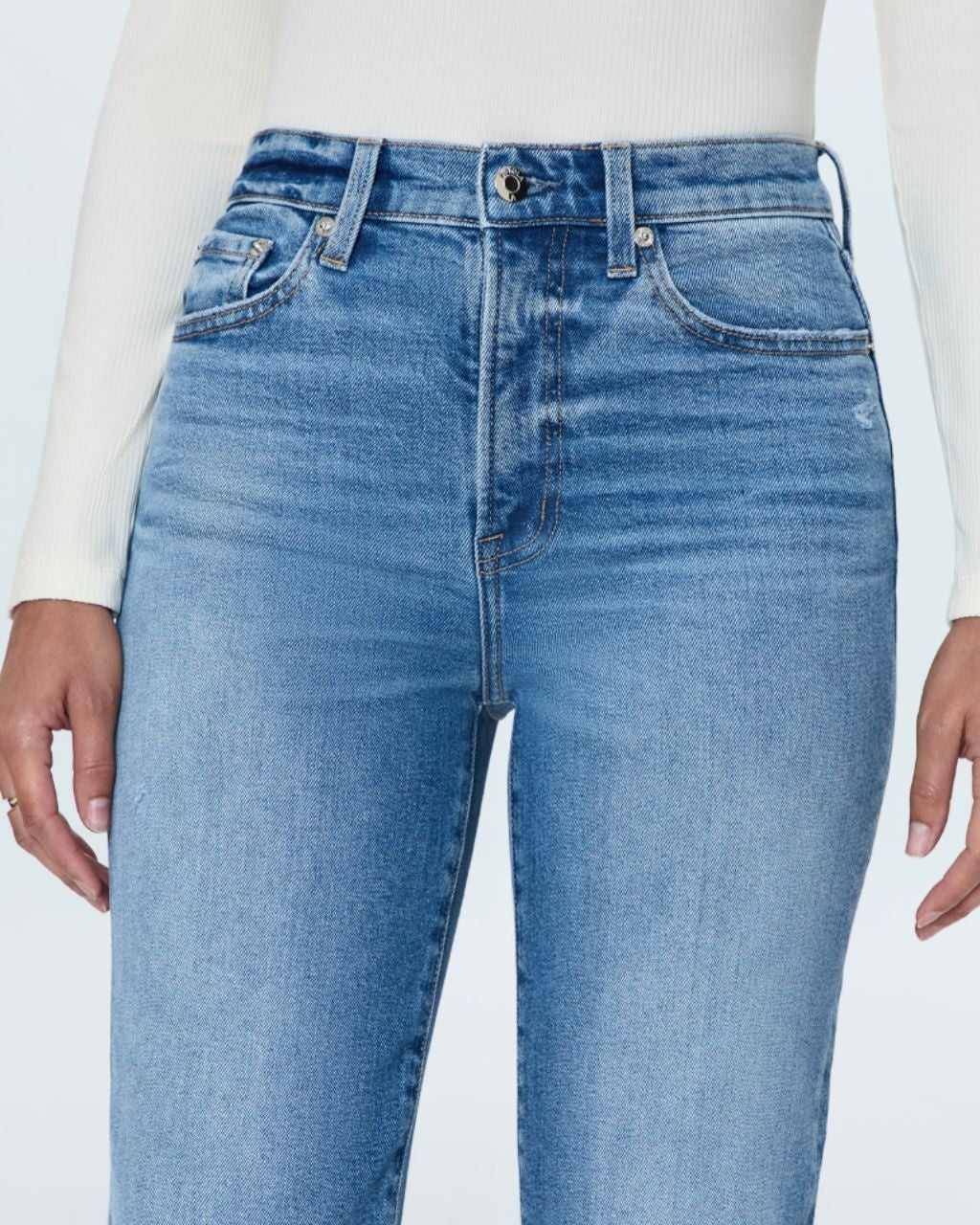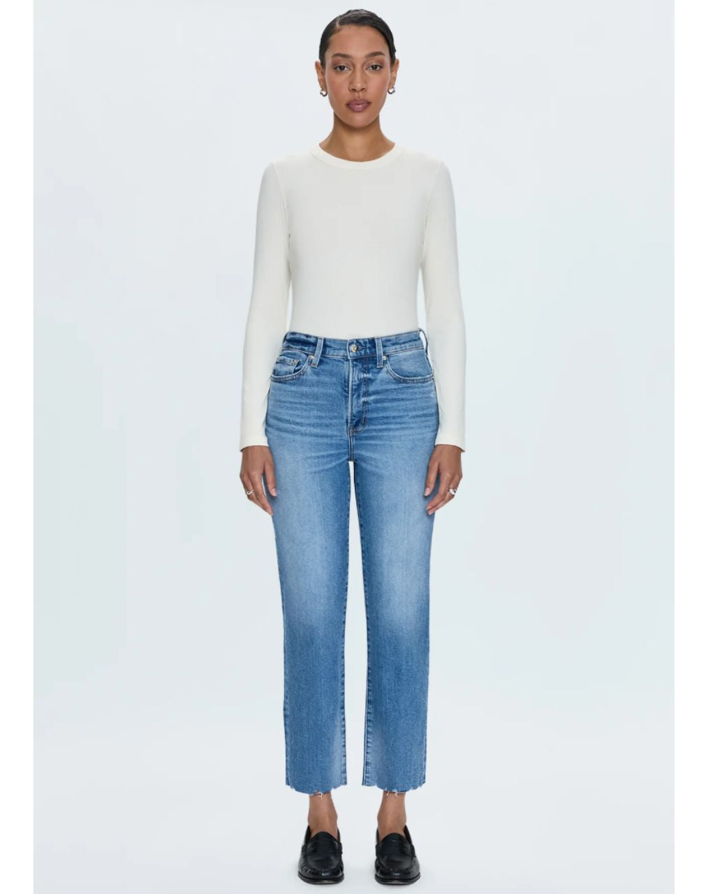 High rise, figure hugging waist that falls to a slim-straight leg silhouette with a cropped, clean finished hem. Crafted from our signature comfort stretch denim for an expert fit and feel.