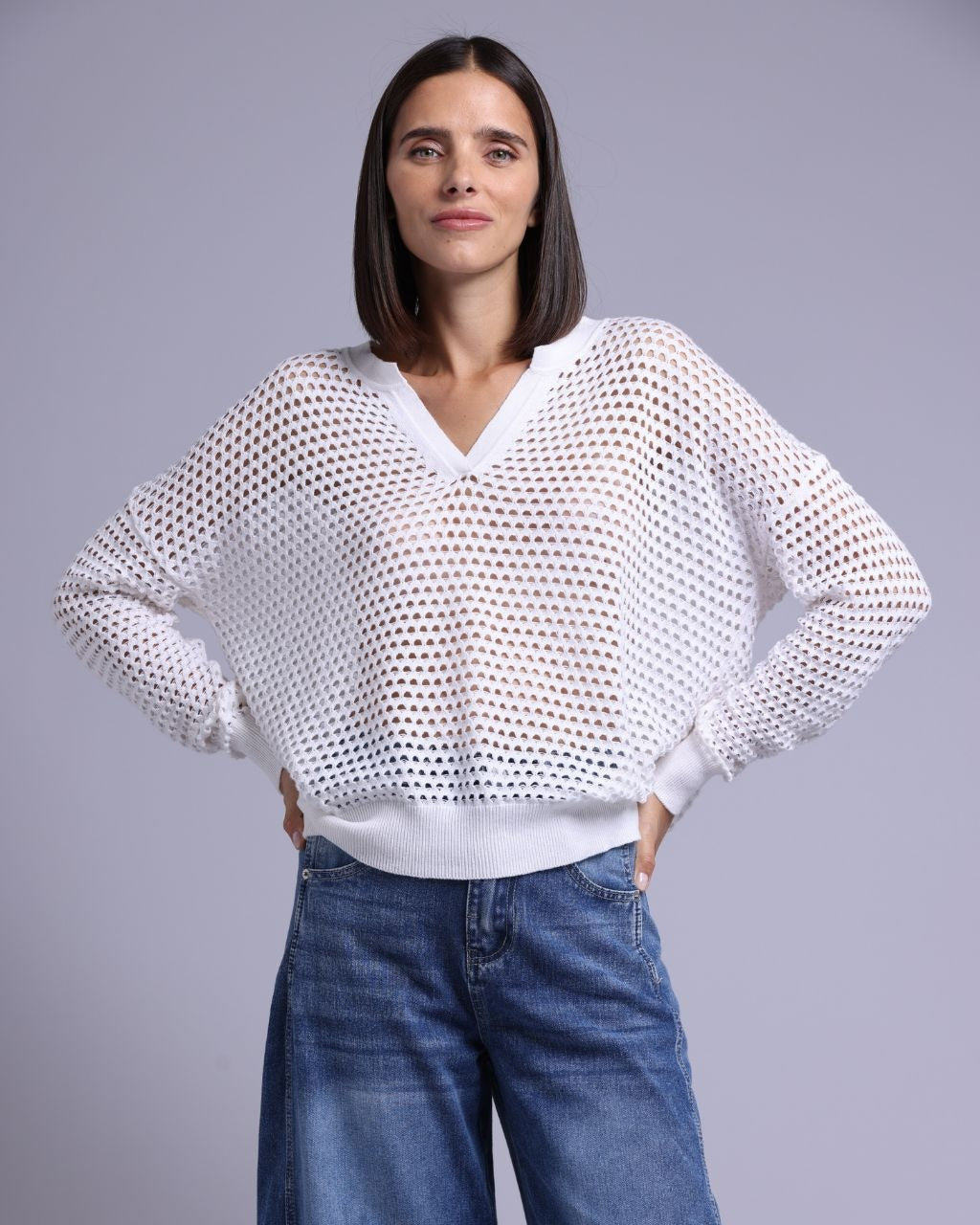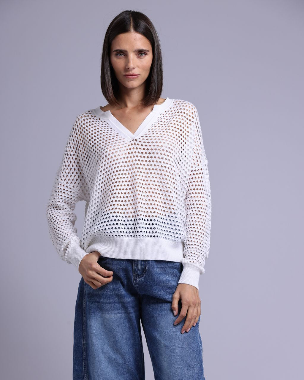 Cotton Cashmere Plaited Mesh Split Neck LS Top