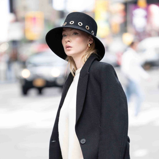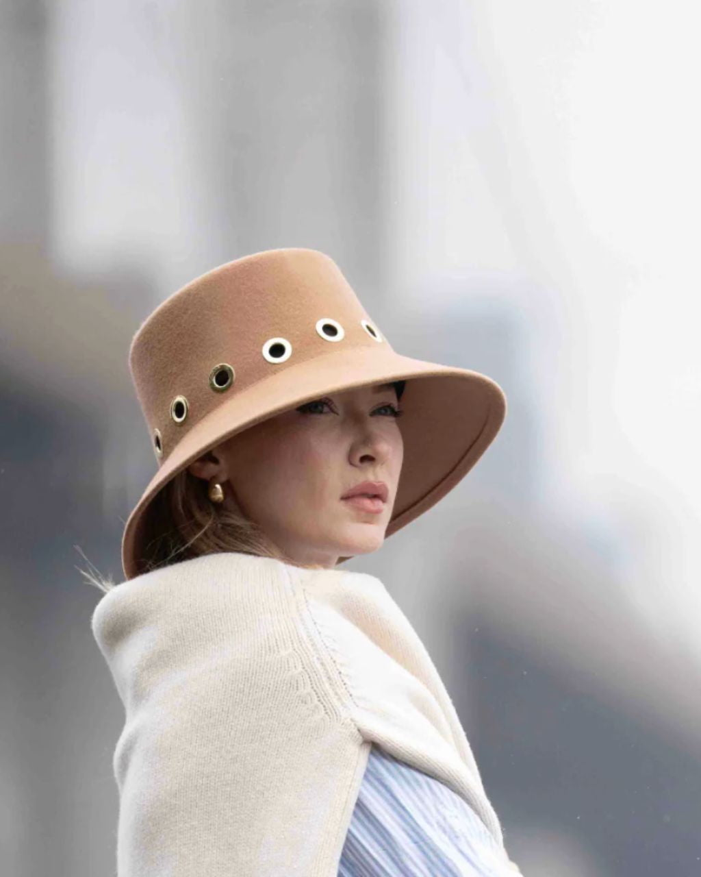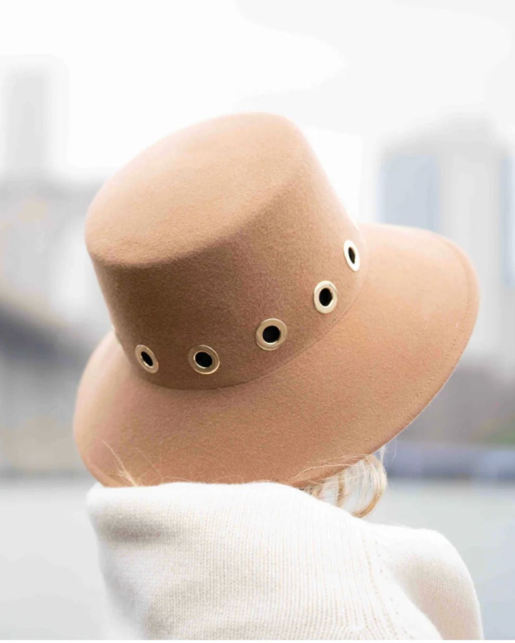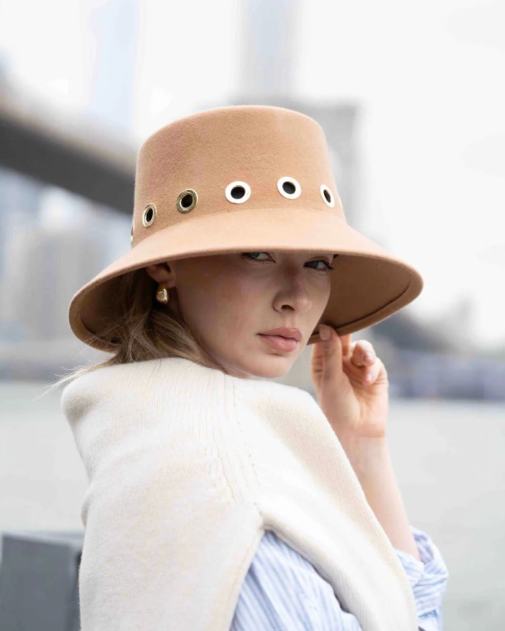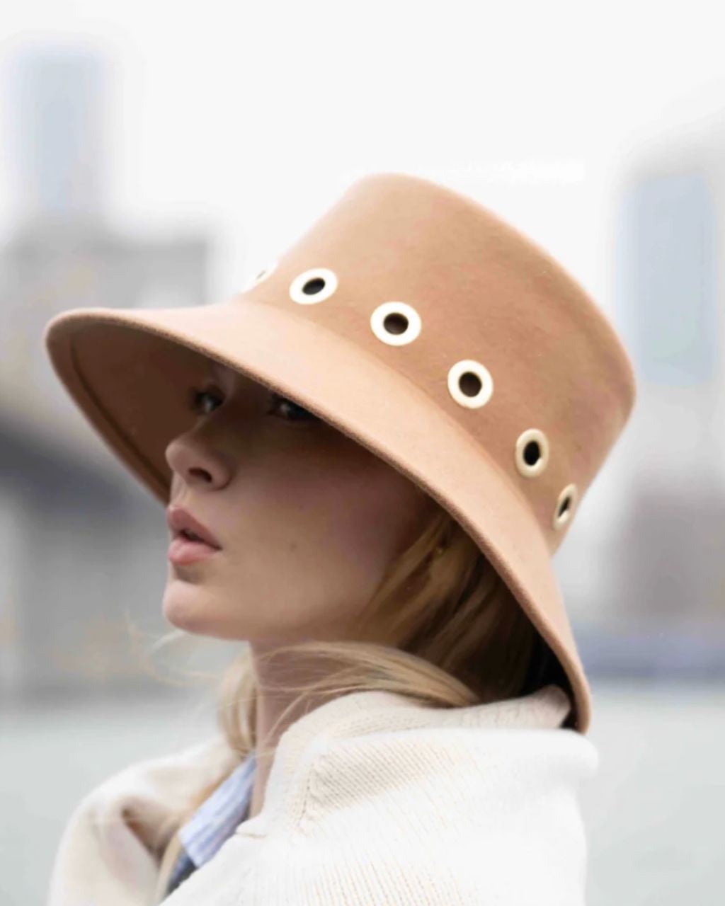 The Courche re-imagines the classic cloche for winter, with gold grommet detailing. Made of water-repellent, 100% felted wool in Italy.