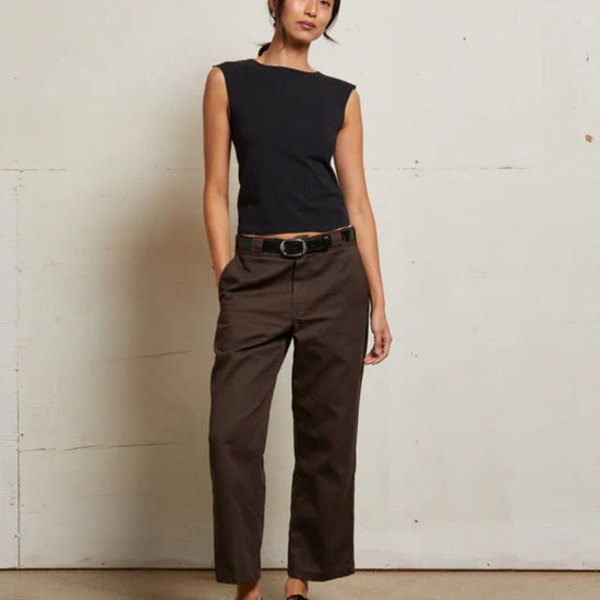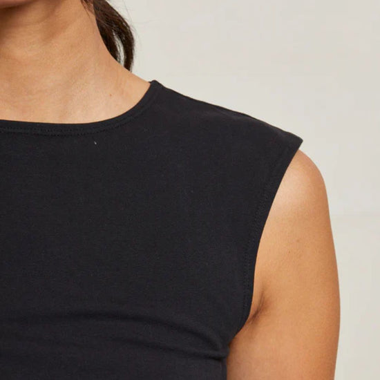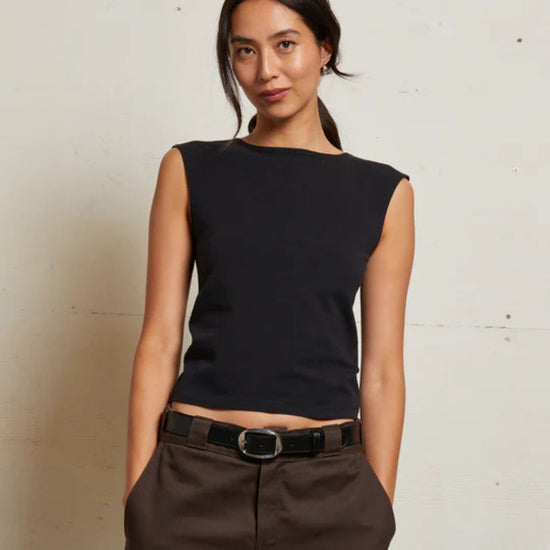 the eleanor top is a nod to the '90s, with a twist of modern edge. part of our 90s jersey collection, this muscle tee is sleeveless yet perfectly balanced. dainty, but with a touch of masculinity. it's not cropped but fitted, sitting right at the natural waist for the ultimate in effortless style.