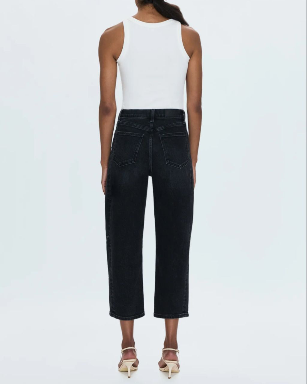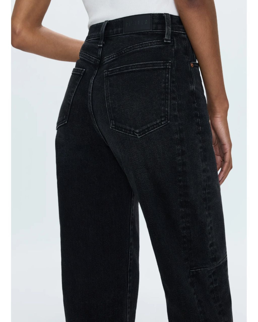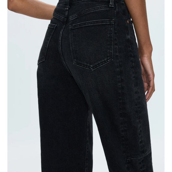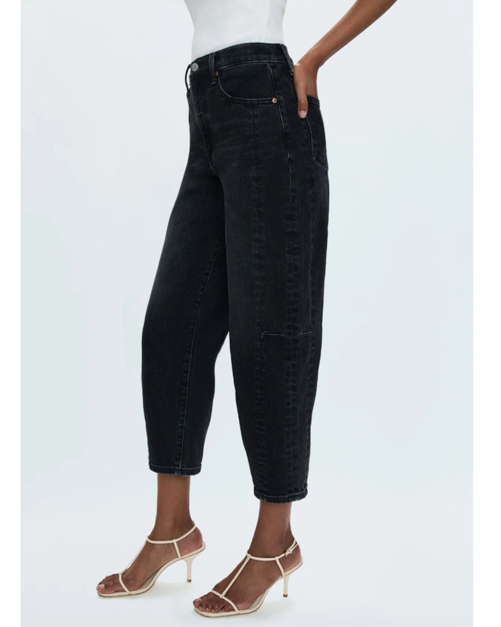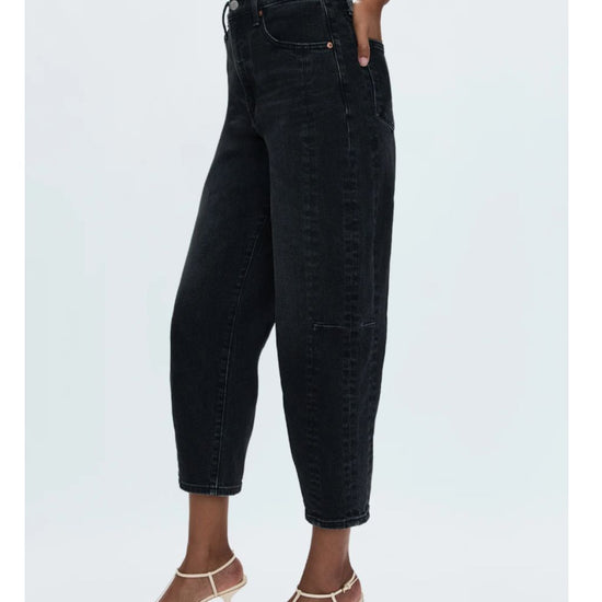 An arresting, modern silhouette designed with a barrel bowed leg and a relaxed silhouette. Crafted from our wear-everywhere comfort stretch denim. Dark Midnight is colored black denim wash that's exclusively ours, featuring subtle lived-in fading and contrast hardware.