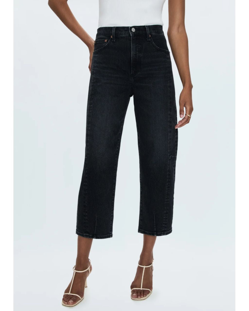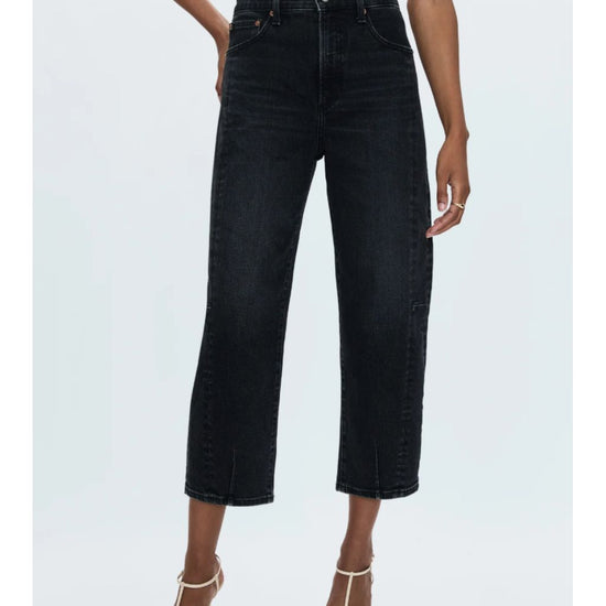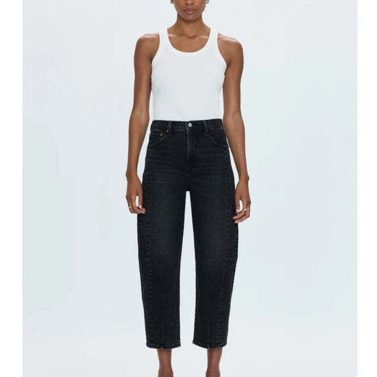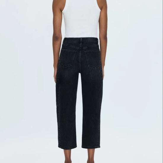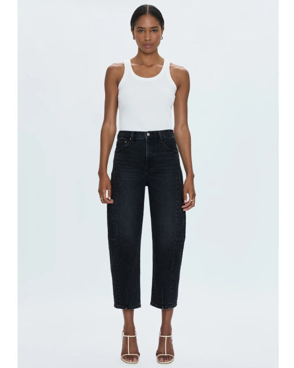 An arresting, modern silhouette designed with a barrel bowed leg and a relaxed silhouette. Crafted from our wear-everywhere comfort stretch denim. Dark Midnight is colored black denim wash that's exclusively ours, featuring subtle lived-in fading and contrast hardware.