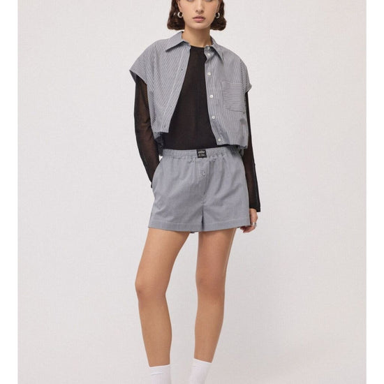 100% cotton top with a shirt collar, elastic waist, and front button closure, featuring a clean, balanced silhouette. A simple yet refined style, ideal for completing summer outfits with wide-leg pants or flowing skirts.
