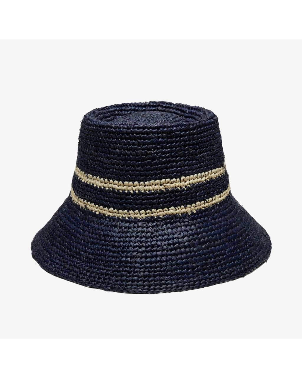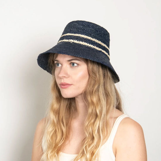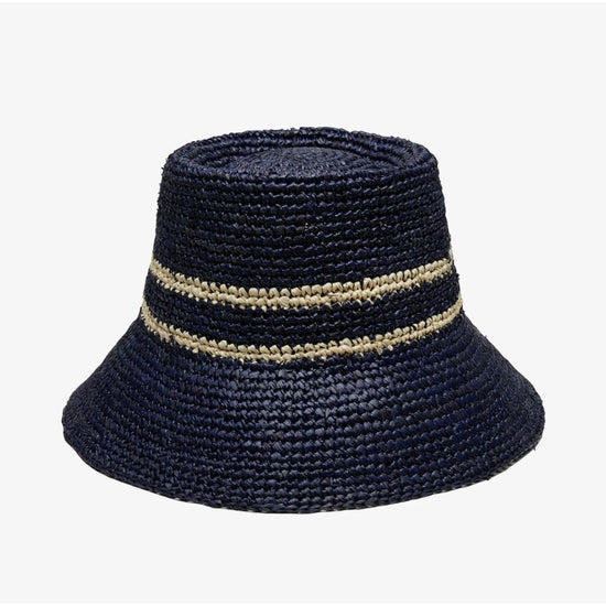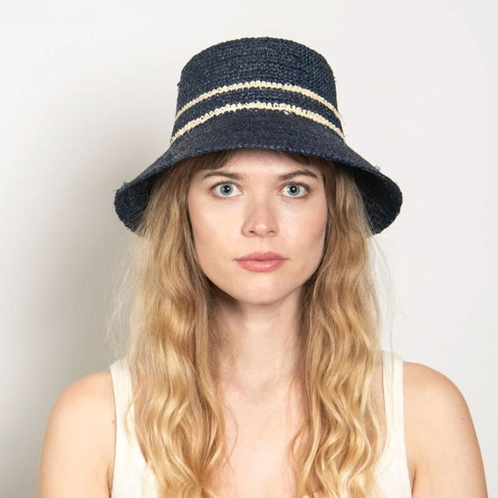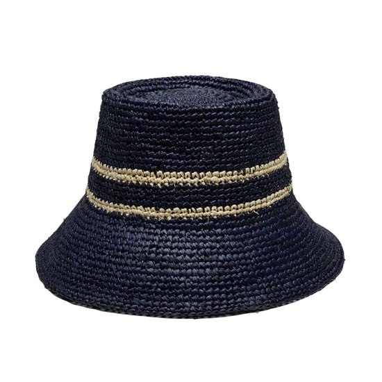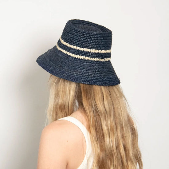 Effortlessly chic and perfect for sunny days, this 100% raffia bucket hat blends a bold blue with a natural toned stripe.