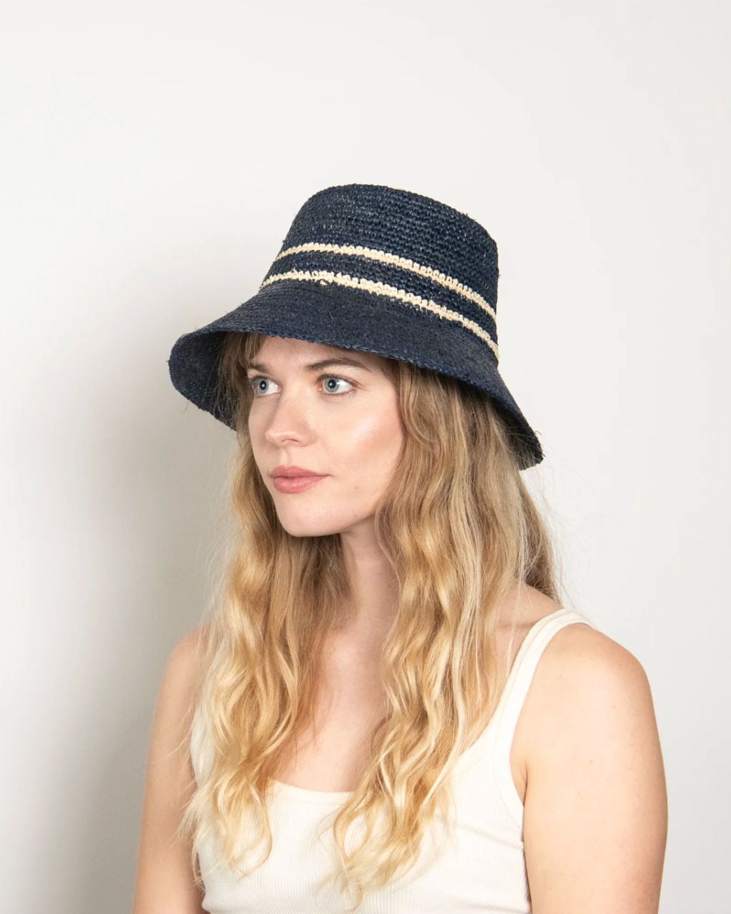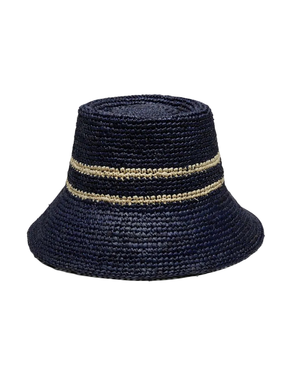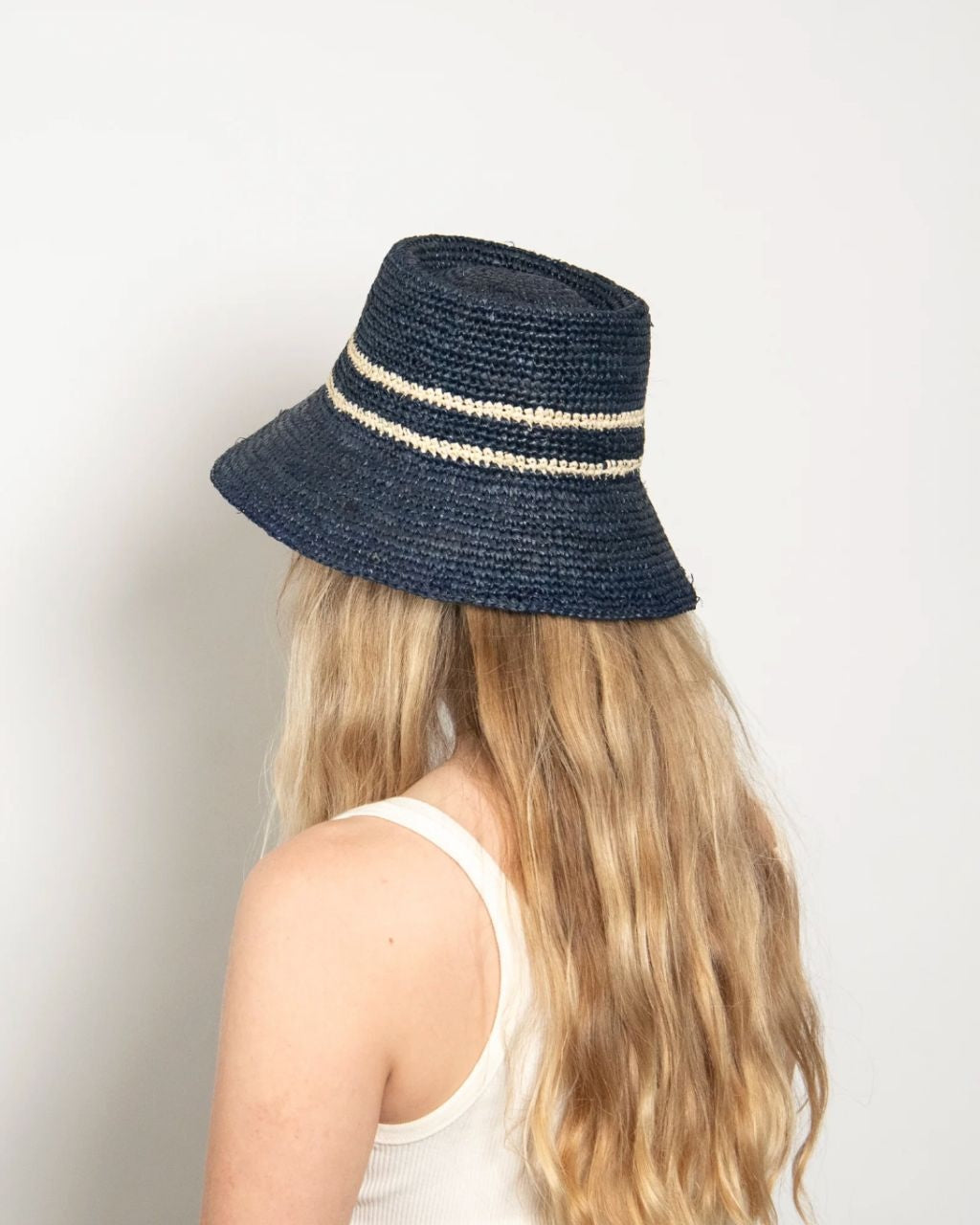 Effortlessly chic and perfect for sunny days, this 100% raffia bucket hat blends a bold blue with a natural toned stripe.