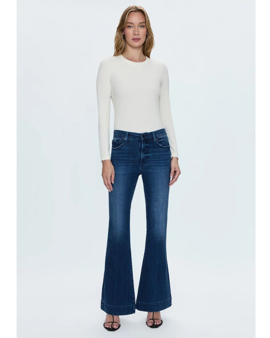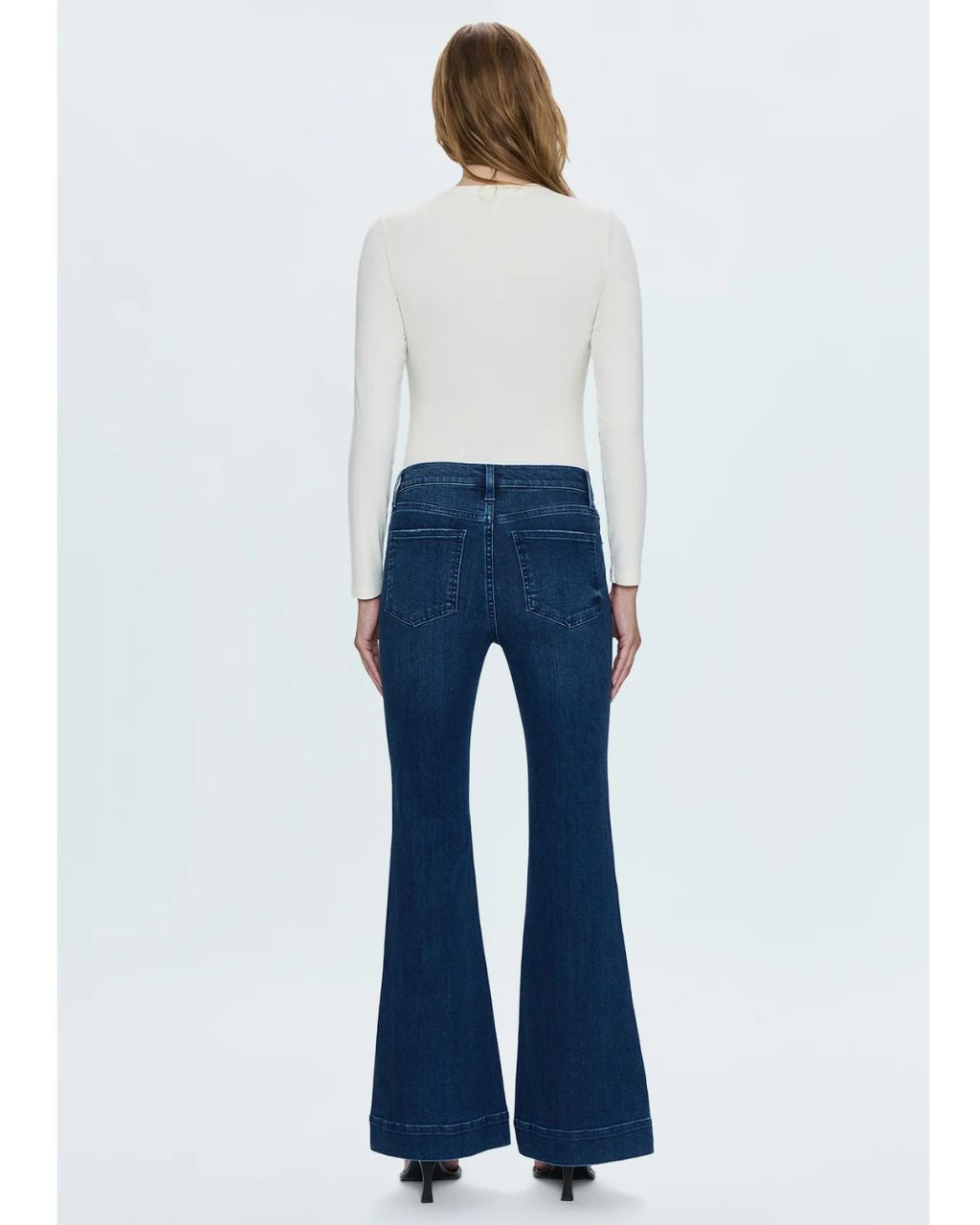 Mid rise waist with a sophisticated ultra-flared leg opening for unquestionably slimming proportions. Crafted from our signature comfort stretch denim. Modern is a deep blue dark denim wash with tonal stitching and gunmetal hardware.