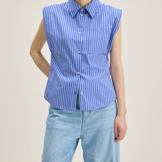 100% cotton sleeveless top with button front. A modern, feminine update on classic shirting, this is a new twist on the classic perfect to pair with jeans or white pants for spring and summer.