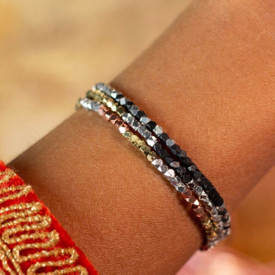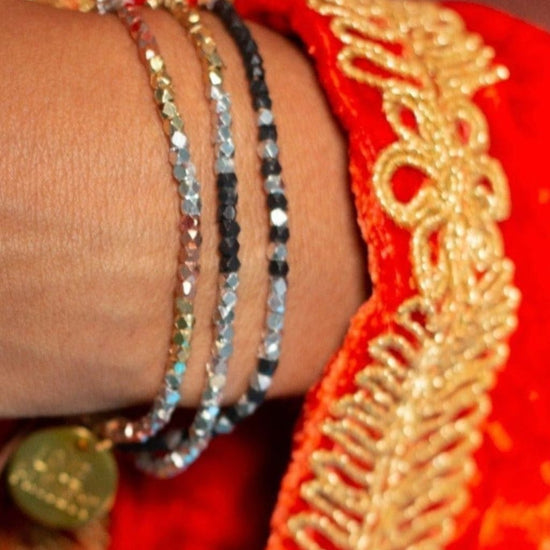 Introducing Kali bracelets - a stunning collection of metallic beaded bracelets from India that are sure to add some serious sparkle, bling, and fun to your wrist! Handcrafted by skilled artisans in India, these bracelets are the perfect way to add a touch of glamour to any outfit, whether you're dressing up for a night out or just want to add some sparkle to your everyday look. Kali is a symbol of feminie energy, creativity and fertility.Portion of proceeds from purchase support Love Is Project’s initiatives for their Indian artisan partners.