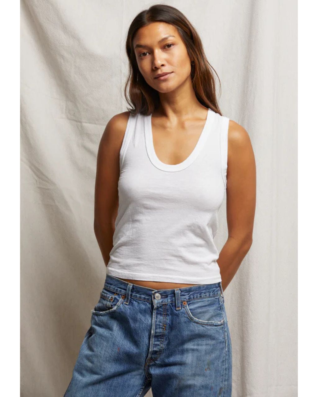 elevate your everyday in our latest bra-friendly tank. made in soft cotton that will fall at your natural waistline. khara is equal parts comfort and style in one piece.