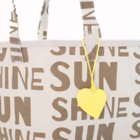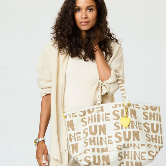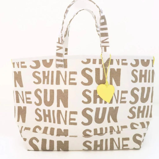 The KR Sunshine is printed with Kerri's Sunshine artwork. This tote is offered in cotton canvas with a complimentary KR charm that hangs on the handles.