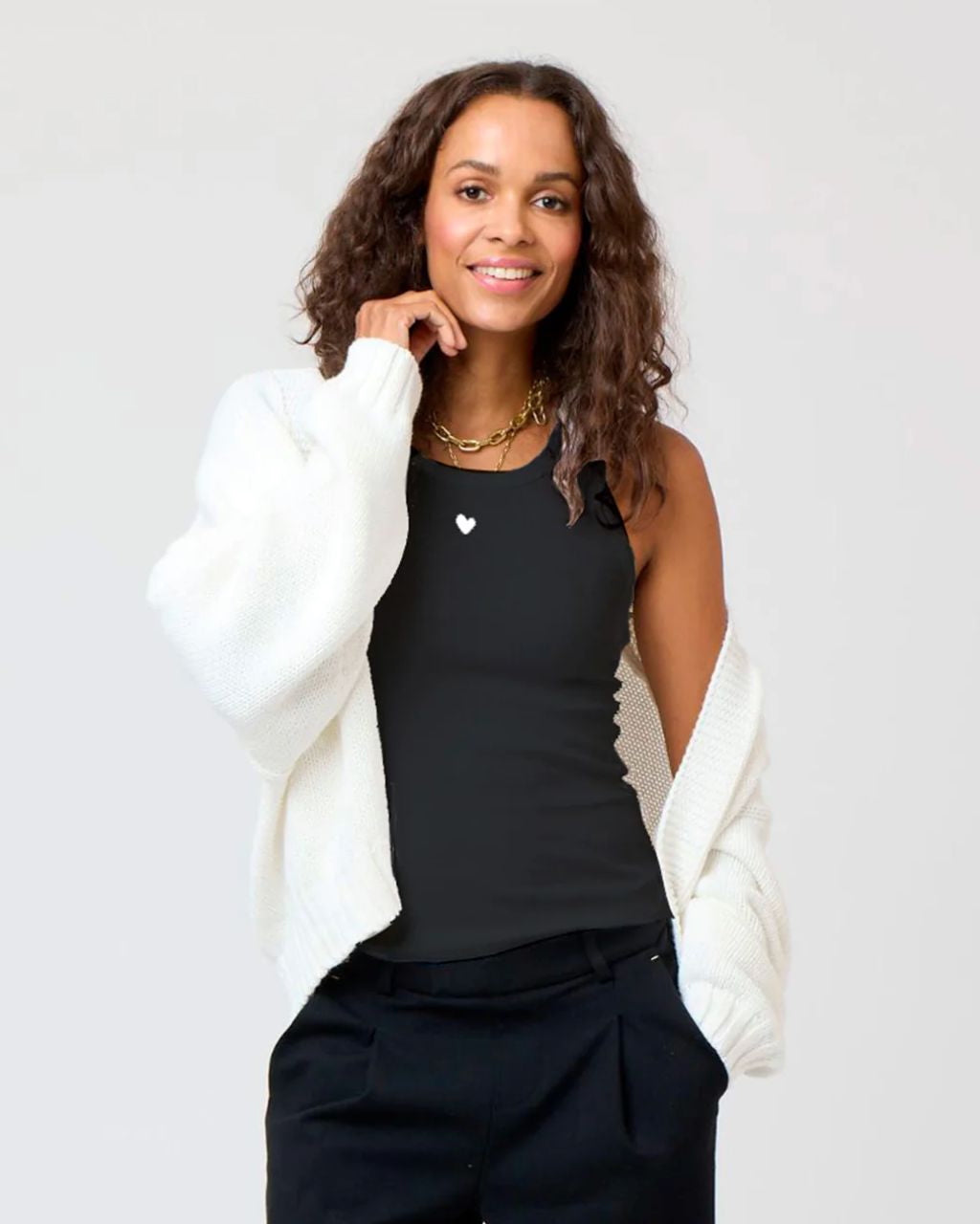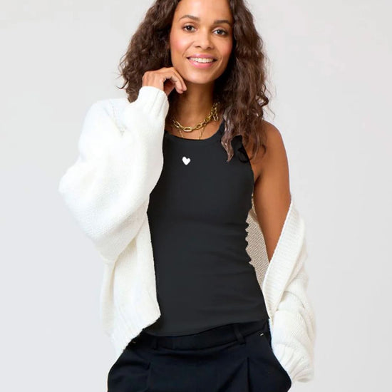 The KR tank is the meant to layer under or to be worn on its own. Not your average tank, this is a statement piece that adds a pop of color and artwork to any cardigan and shirt you wear over.