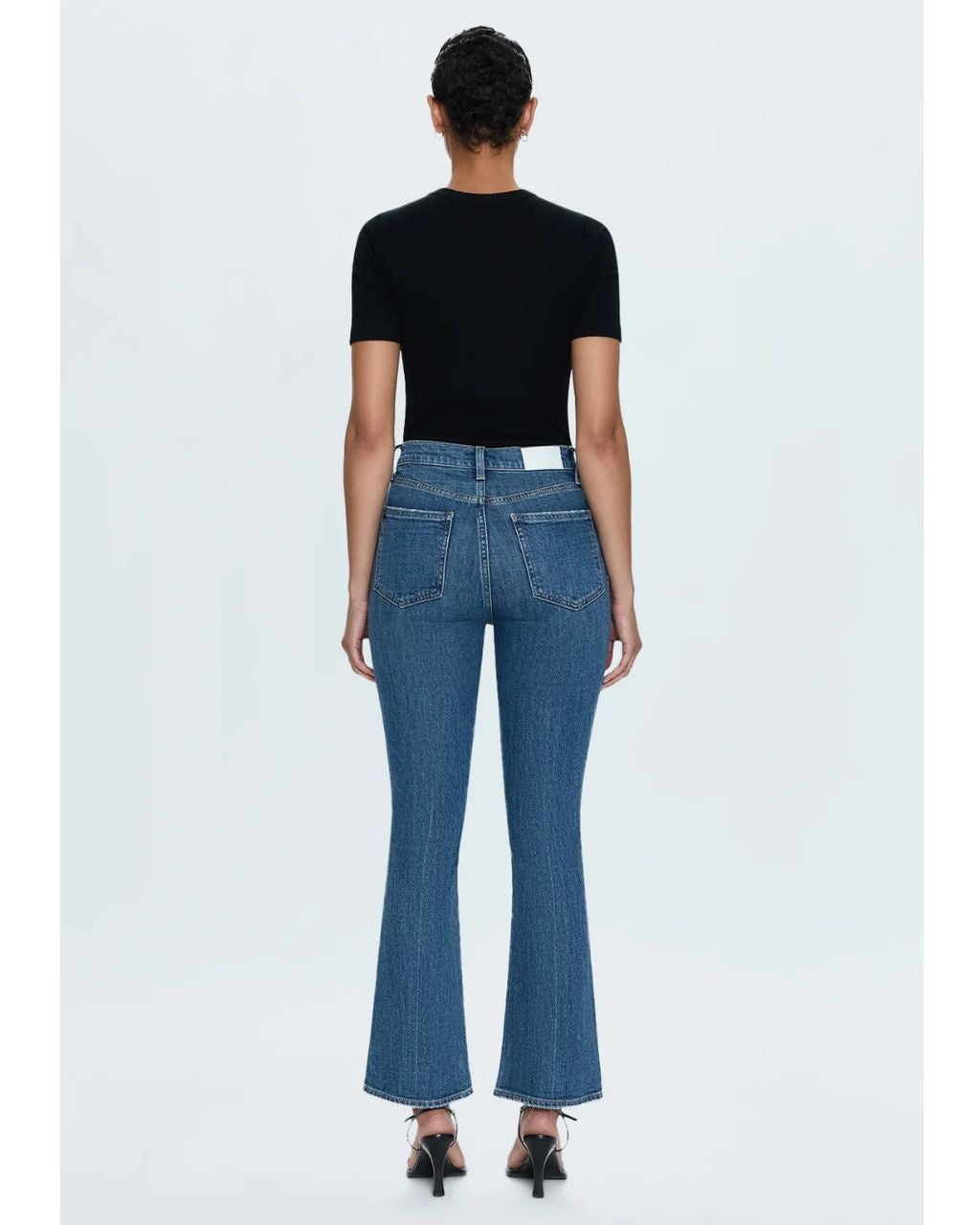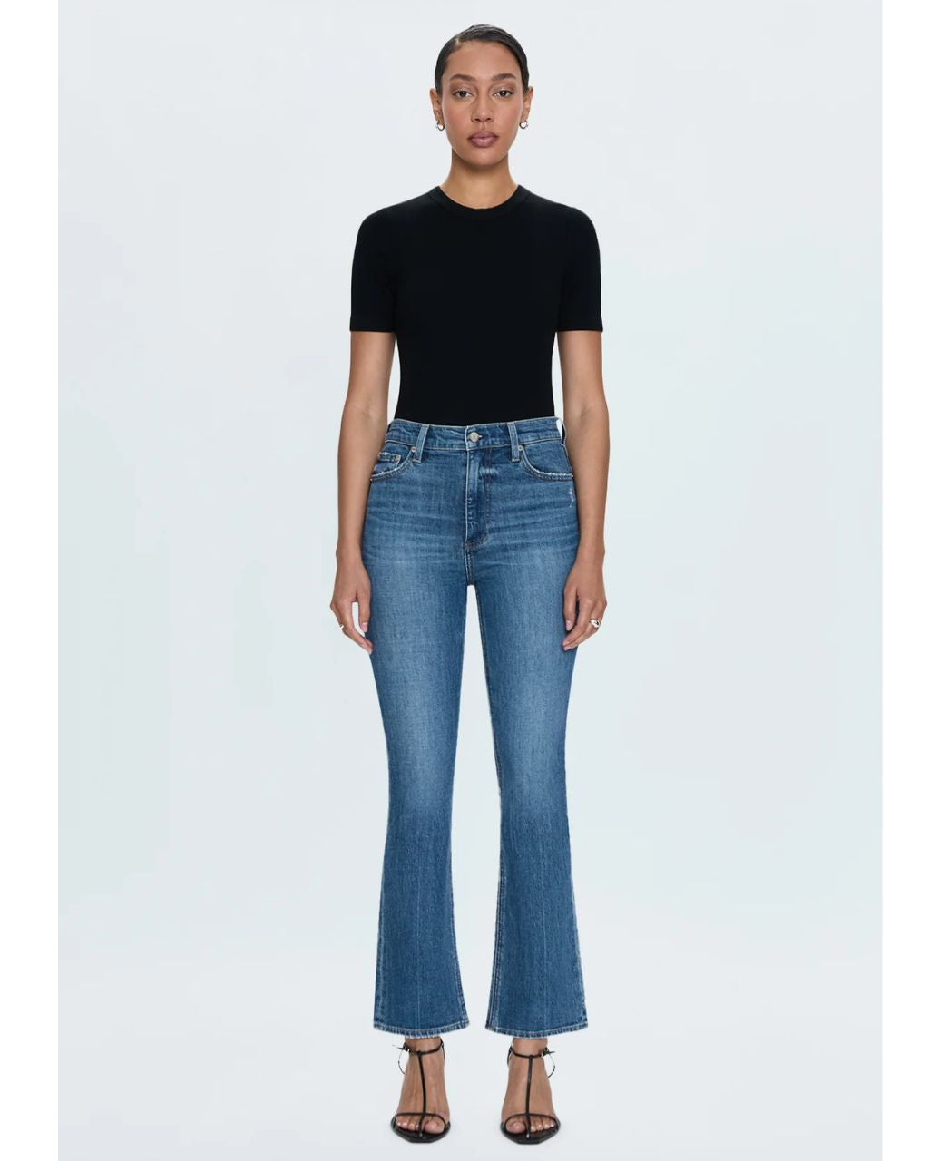 Modern, slimmed down update to the classic bootcut. High rise waist and a full length hem with clean finished, crafted from our signature comfort stretch denim.