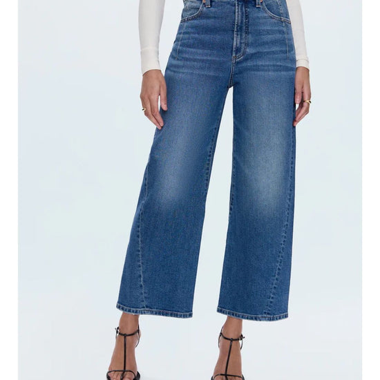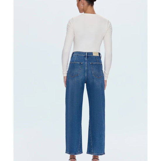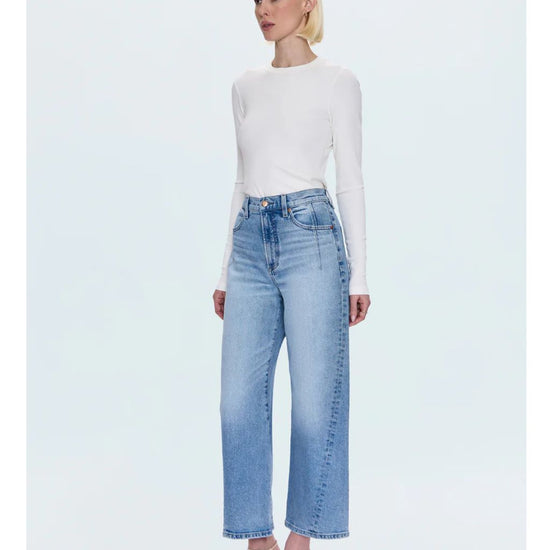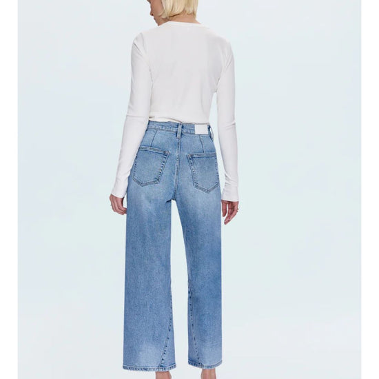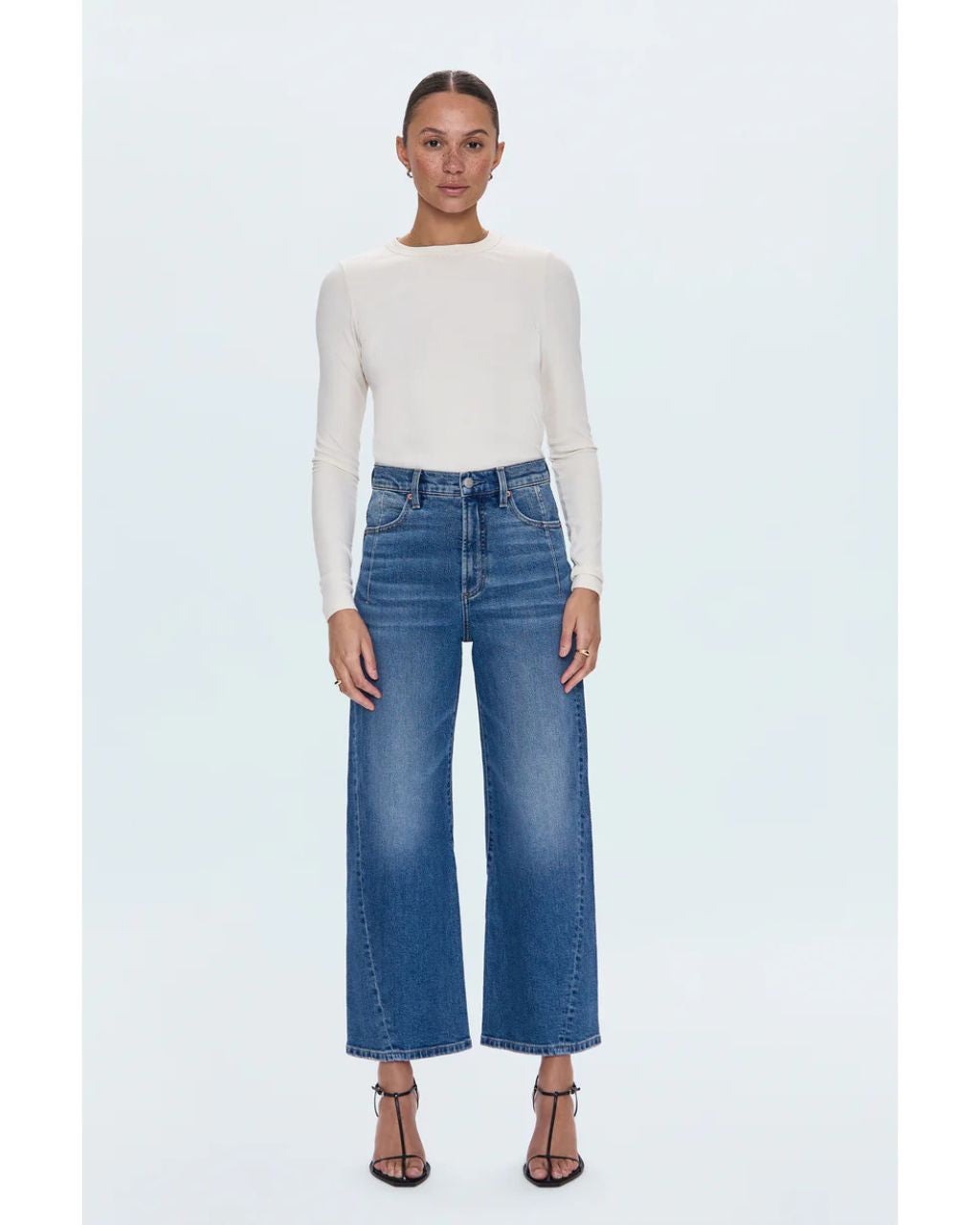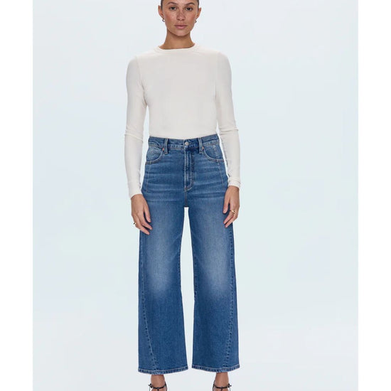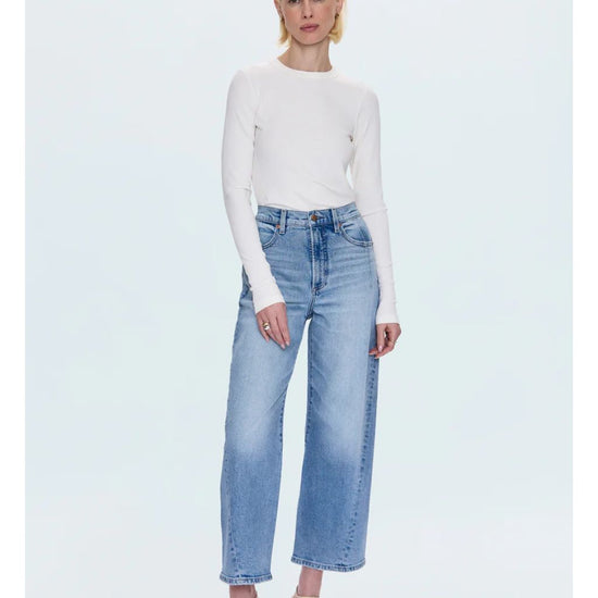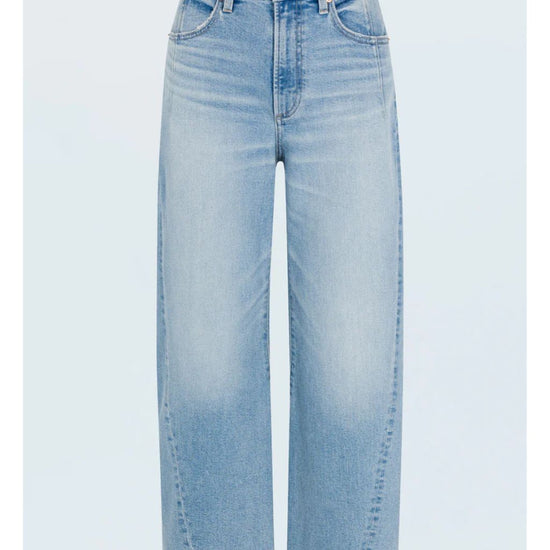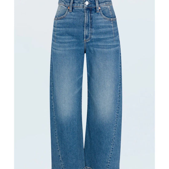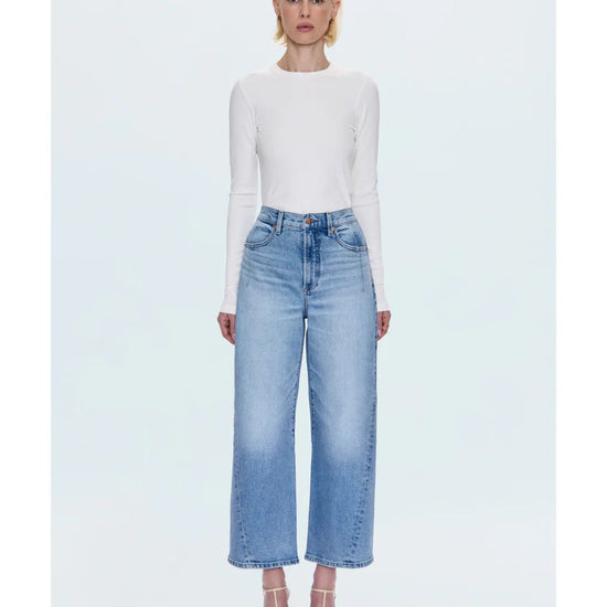 The new must-have jean with a twist. Kyra sits confidently at a high rise with our signature bowed leg silhouette and cropped 28" inseam. The subtle curve creates dimension while the wide ankle opening adds modern proportion with a new wide angle for the season. Fashion detail seaming, including a twisted seam that moves forward and yoke seams in the back, brings modern denim classic sophistication. Crafted from our signature comfort stretch denim in Terrace, a light vintage inspired wash with subtle fading that feels both contemporary and timeless.