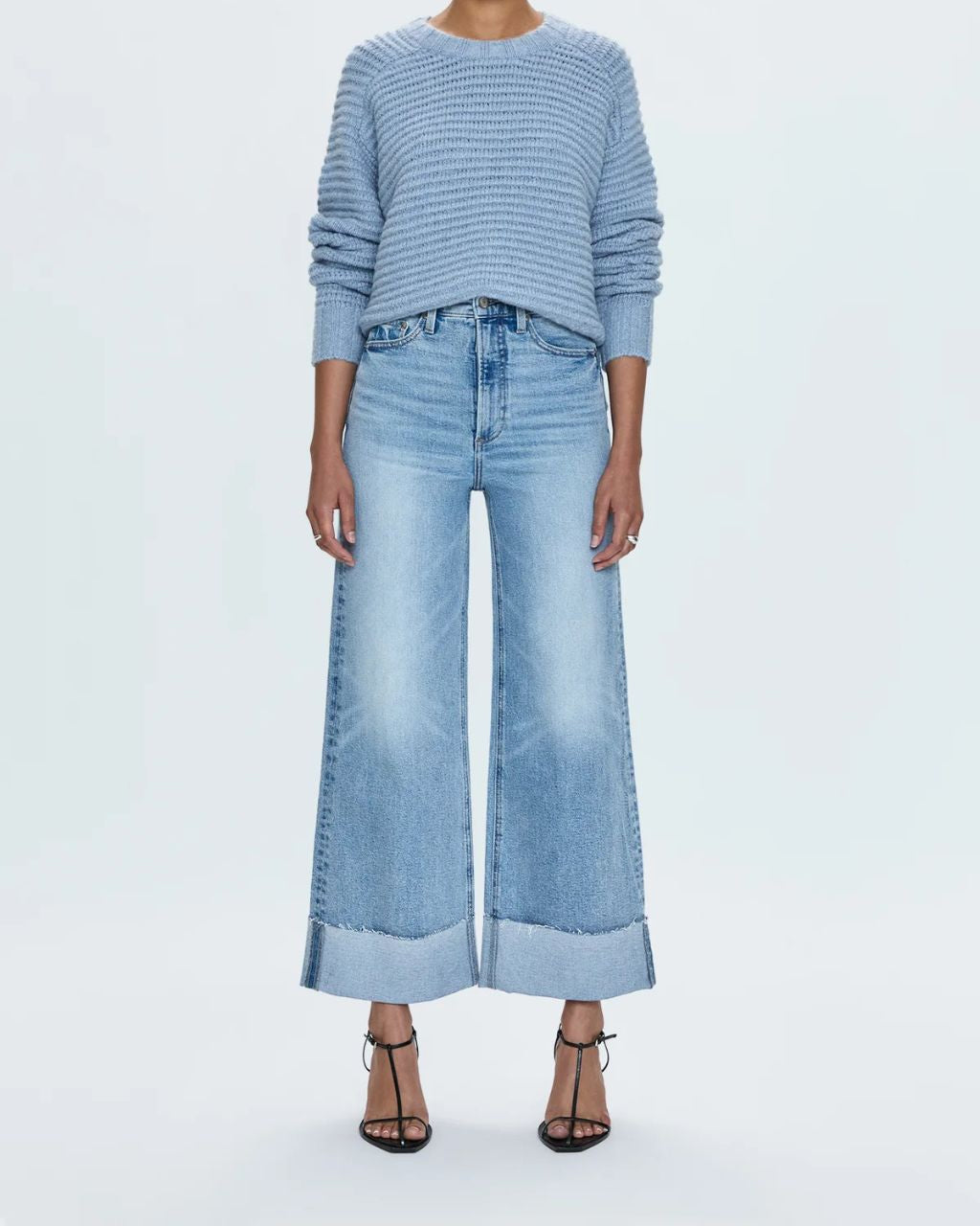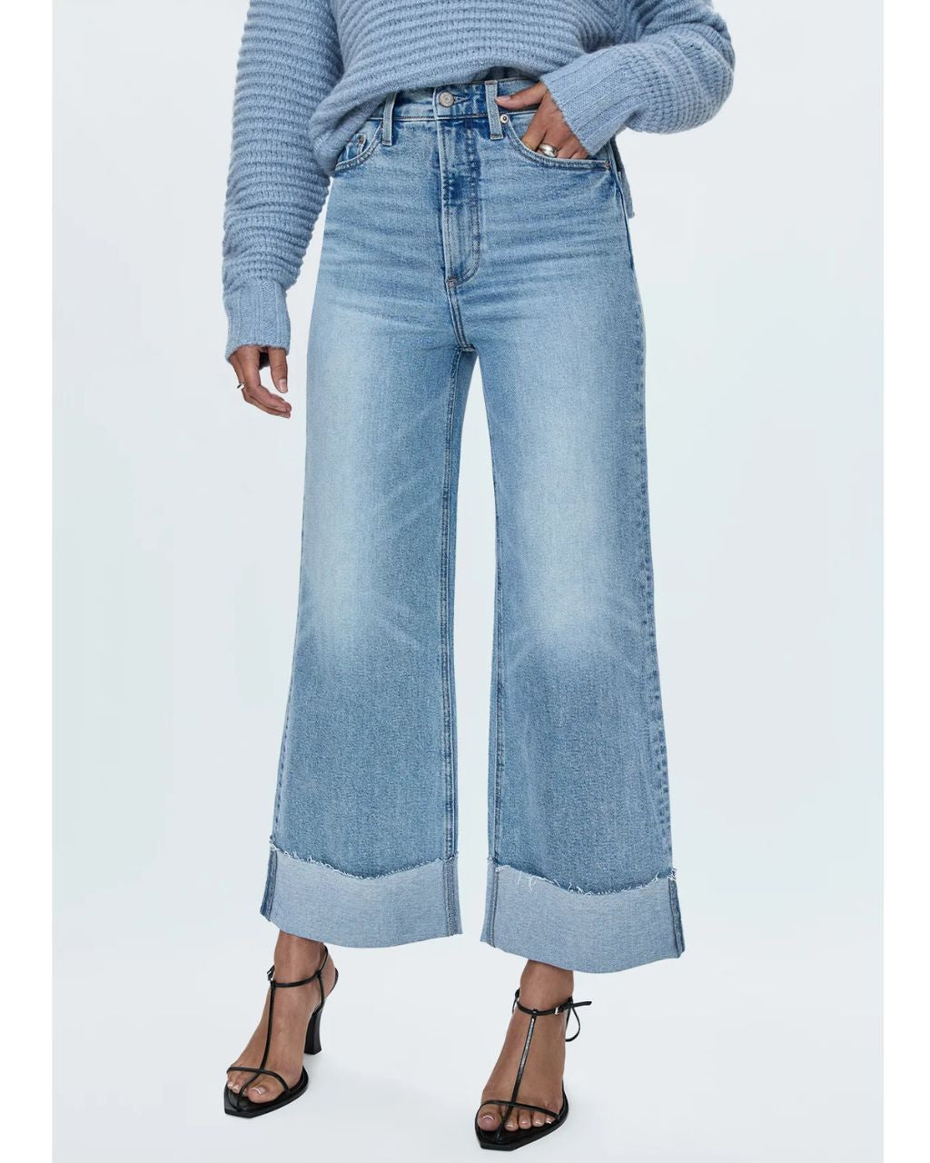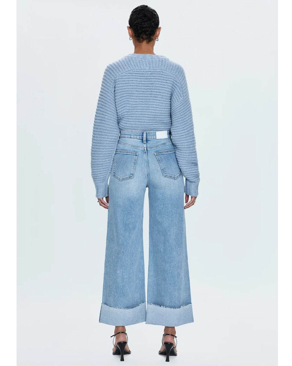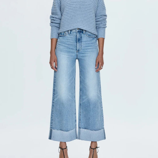 A relaxed, ultra wide leg silhouette with a breezy 27" length featuring a raw finished hem and wide, stitched cuffs. Crafted from our signature comfort stretch denim to provide a structured shape with just the right give.