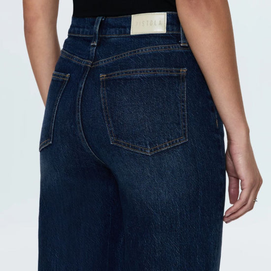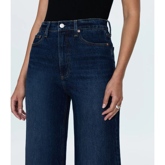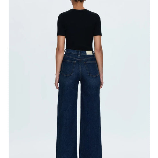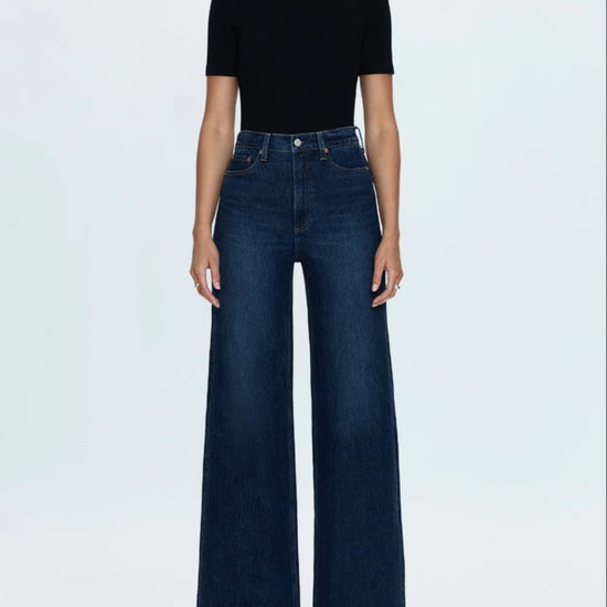 A relaxed, ultra wide leg silhouette with a high rise waist, breezy full length cut, and a clean finish hem. Crafted from our signature comfort stretch denim to provide a structured shape with just the right give. Elevation is an ultra dark indigo wash with contrast stitching and hardware and clean finishes free of distressing.