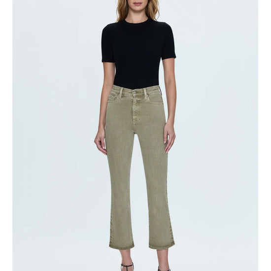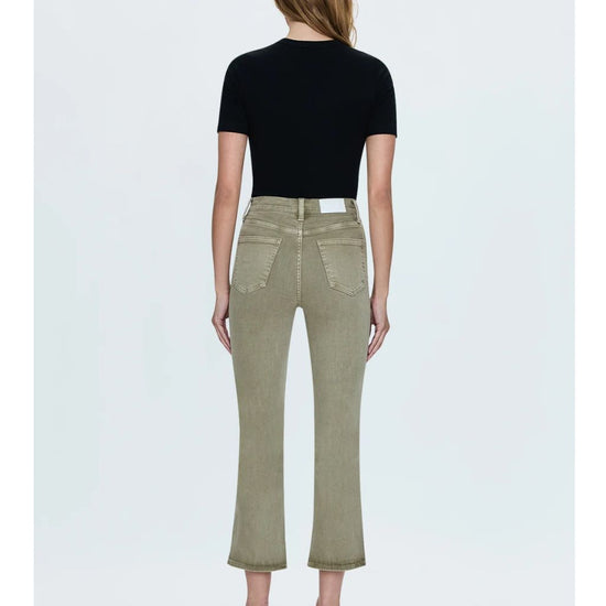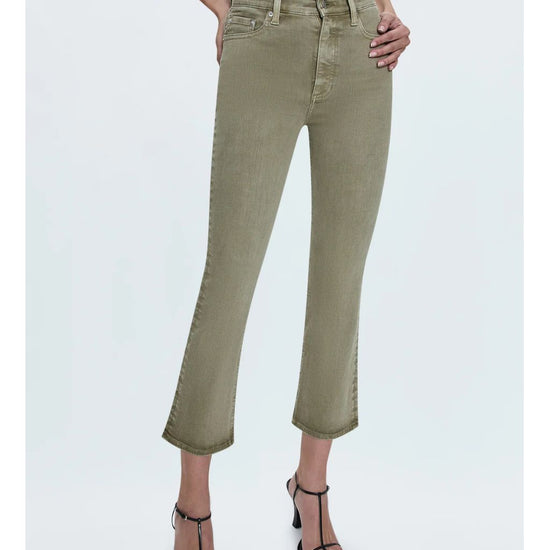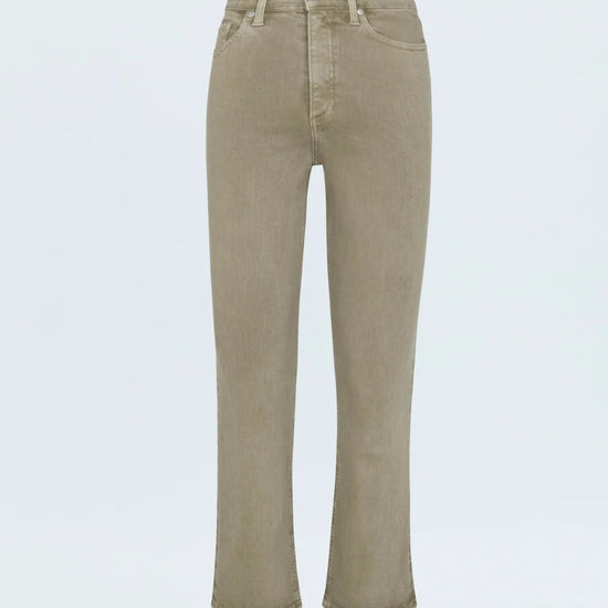 Our best selling bootcut silhouette with a high rise waist and 27" hem length with a clean finish. Crafted from our best selling comfort-stretch denim with clean finishes and free of distressing. Green Willow is a soft, warm olive green colored denim with tonal stitching and chrome hardware.