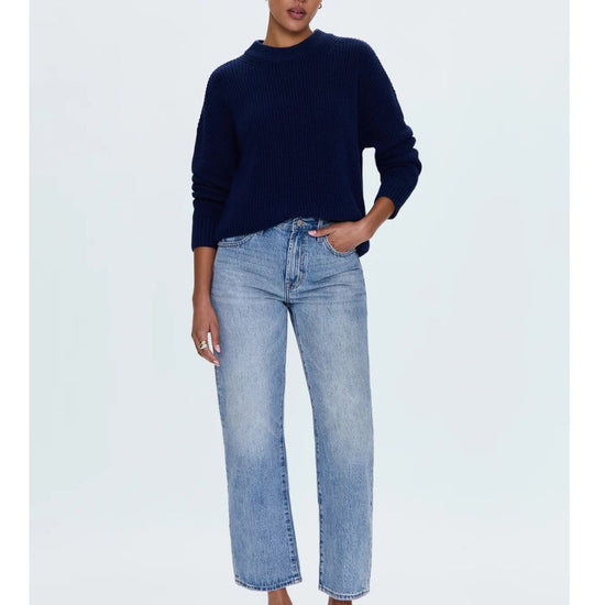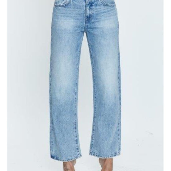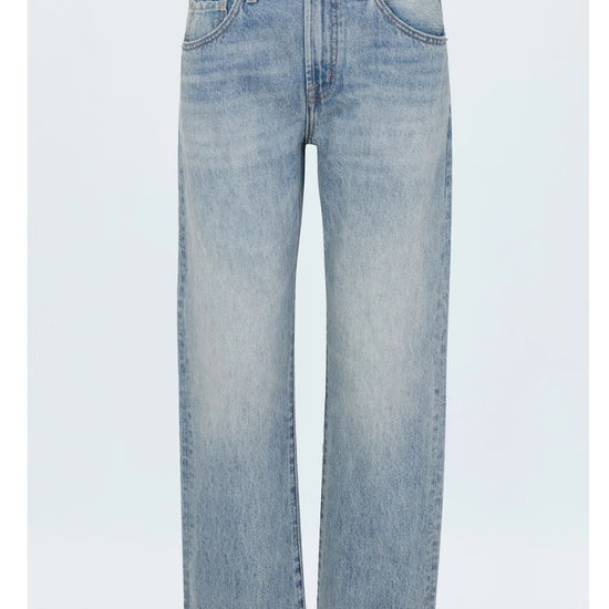 Mid-rise, with a straight leg that bows at the knees for an arched, barrel leg silhouette. Ankle length crop with a clean hem. Bowie is a light wash with lived in fading around the knees and thighs.