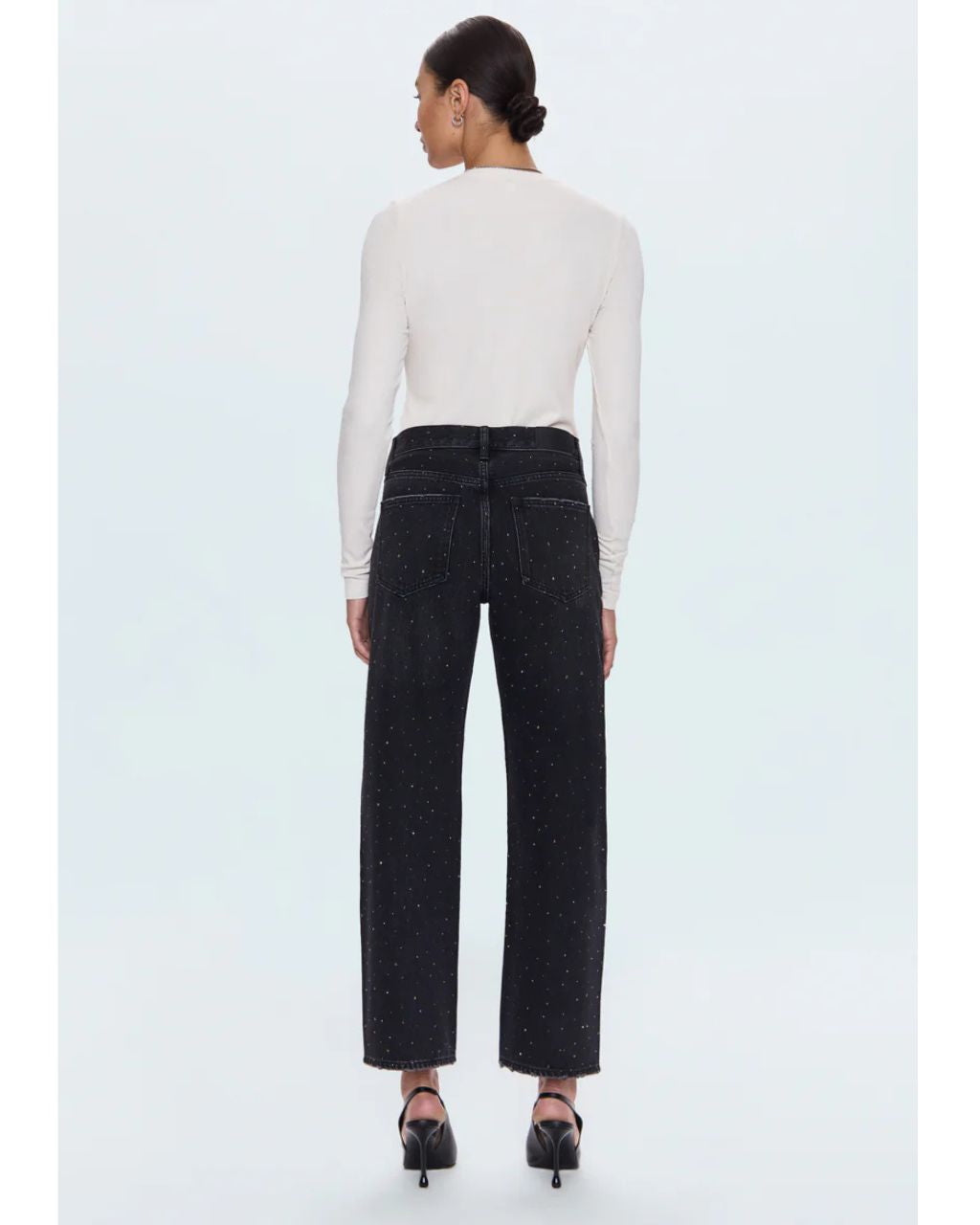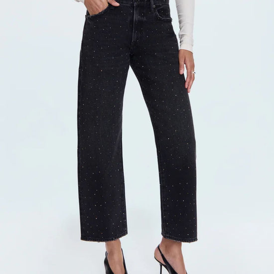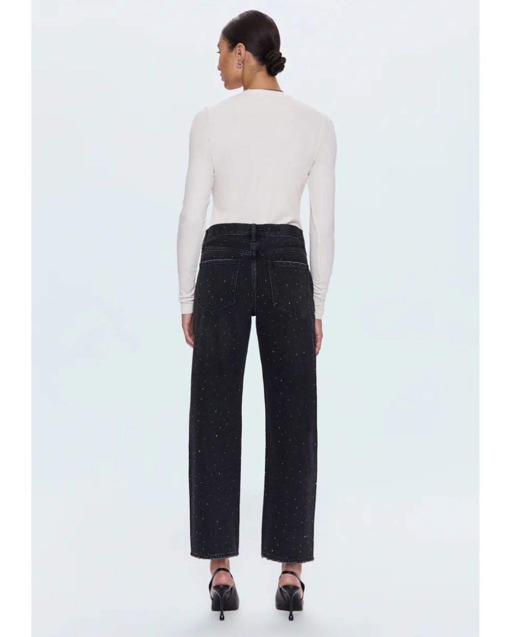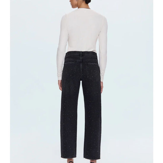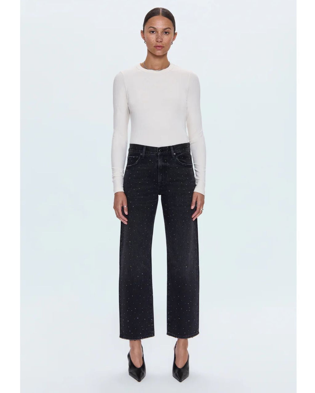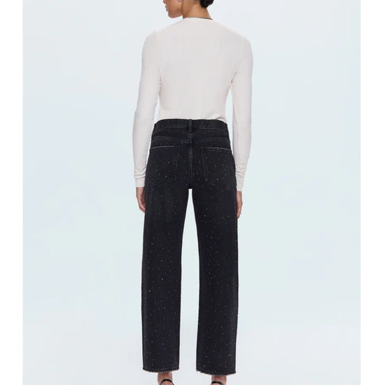 A best-selling silhouette, Lexi features a mid-rise and signature bowed straight leg with a subtle curve through the knee for dimension and ease. The 29" inseam tapers to a clean, cropped ankle. Crafted from rigid denim in Silver Screen, a black wash adorned with micro rhinestones that catch the light for understated shimmer.