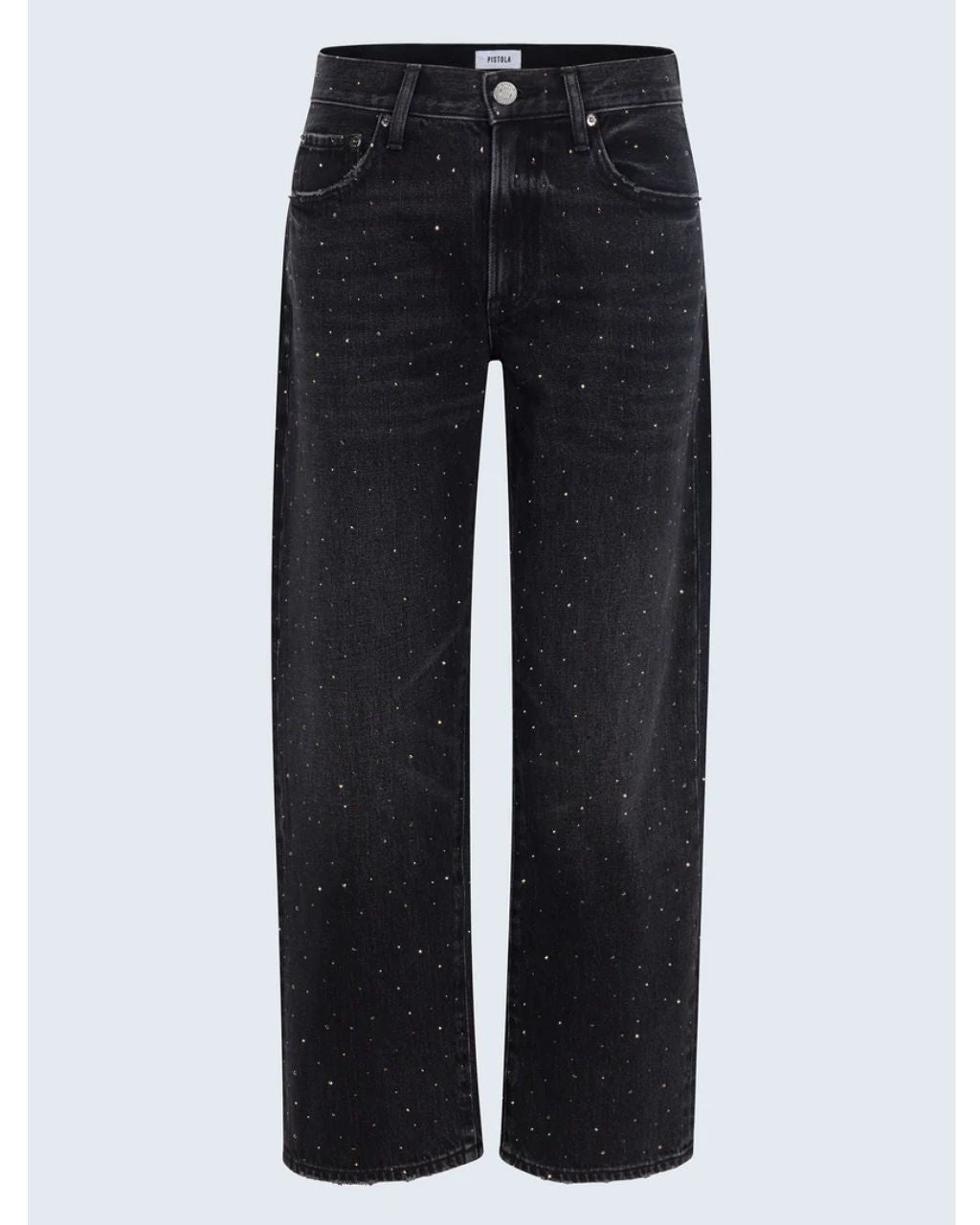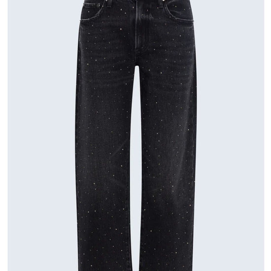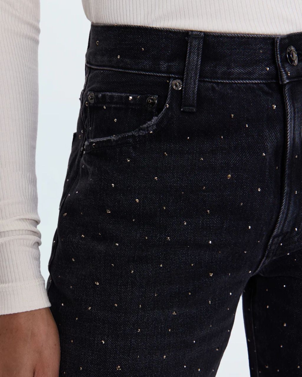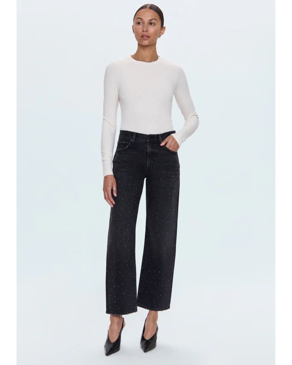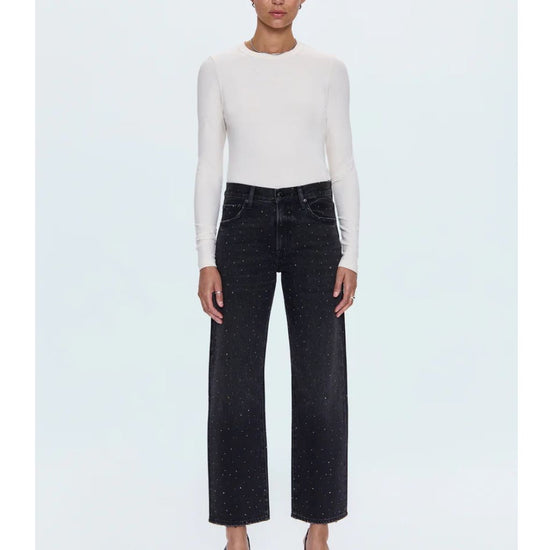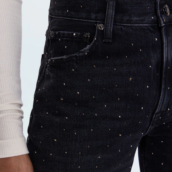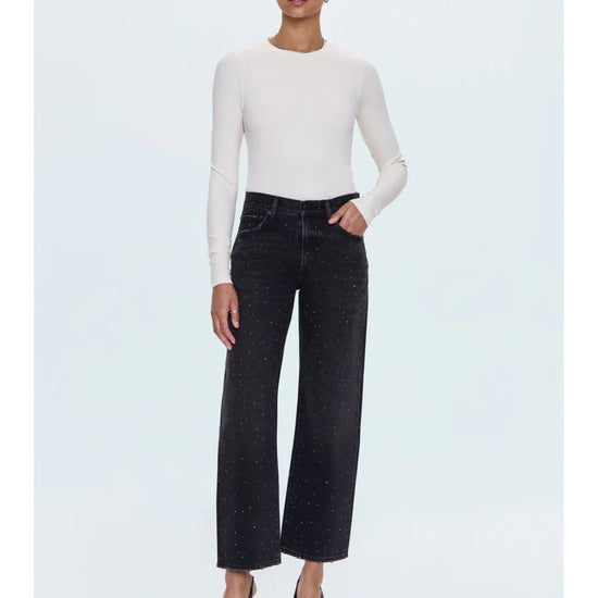 A best-selling silhouette, Lexi features a mid-rise and signature bowed straight leg with a subtle curve through the knee for dimension and ease. The 29" inseam tapers to a clean, cropped ankle. Crafted from rigid denim in Silver Screen, a black wash adorned with micro rhinestones that catch the light for understated shimmer.