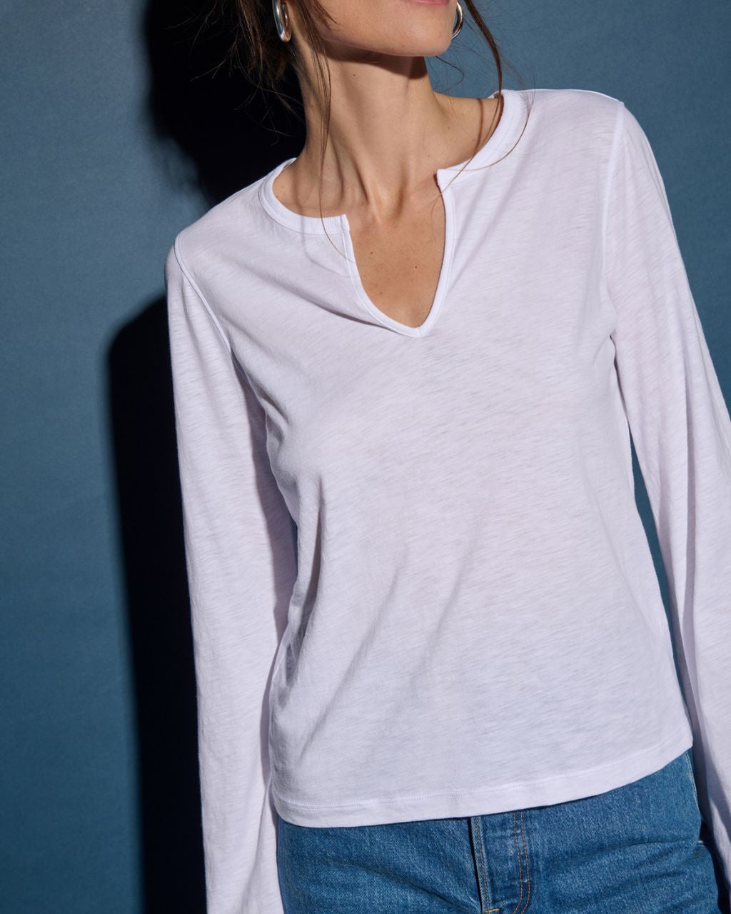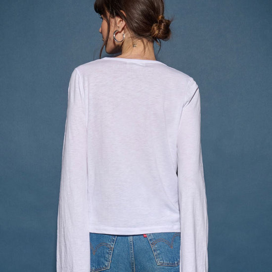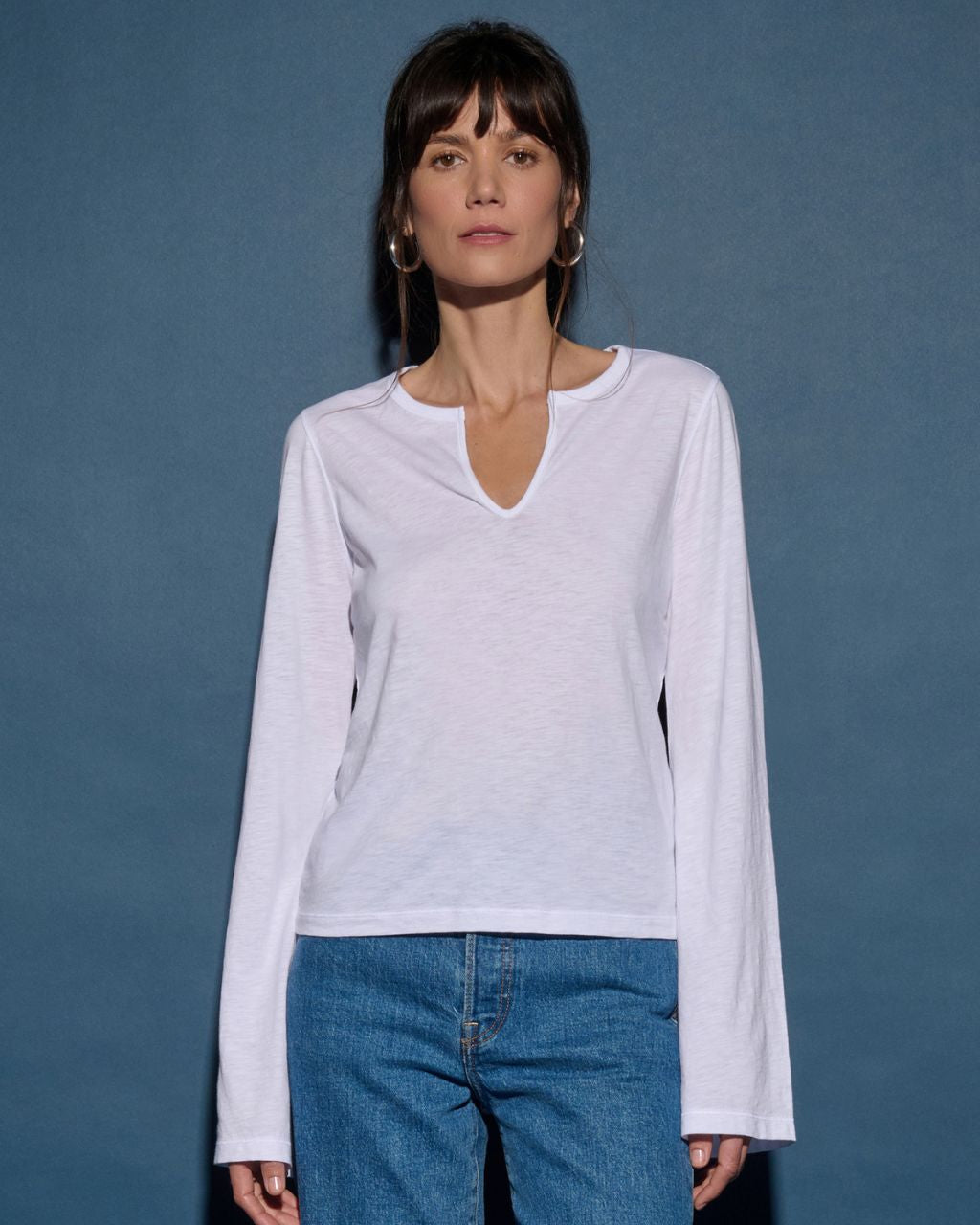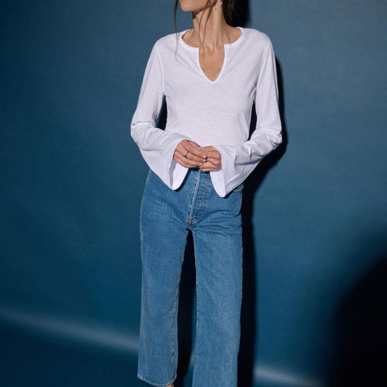 This effortless bell sleeve top speaks for itself. Easy fit, keyhole at the neckline, and ribbed binding. (This one comes in Jet Black and White.)