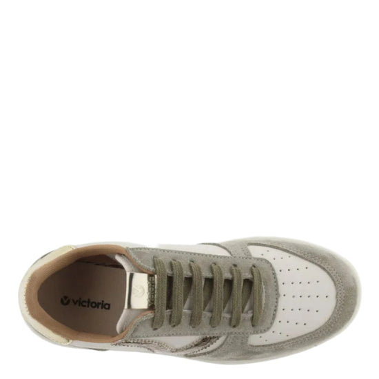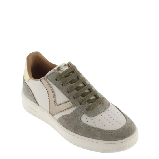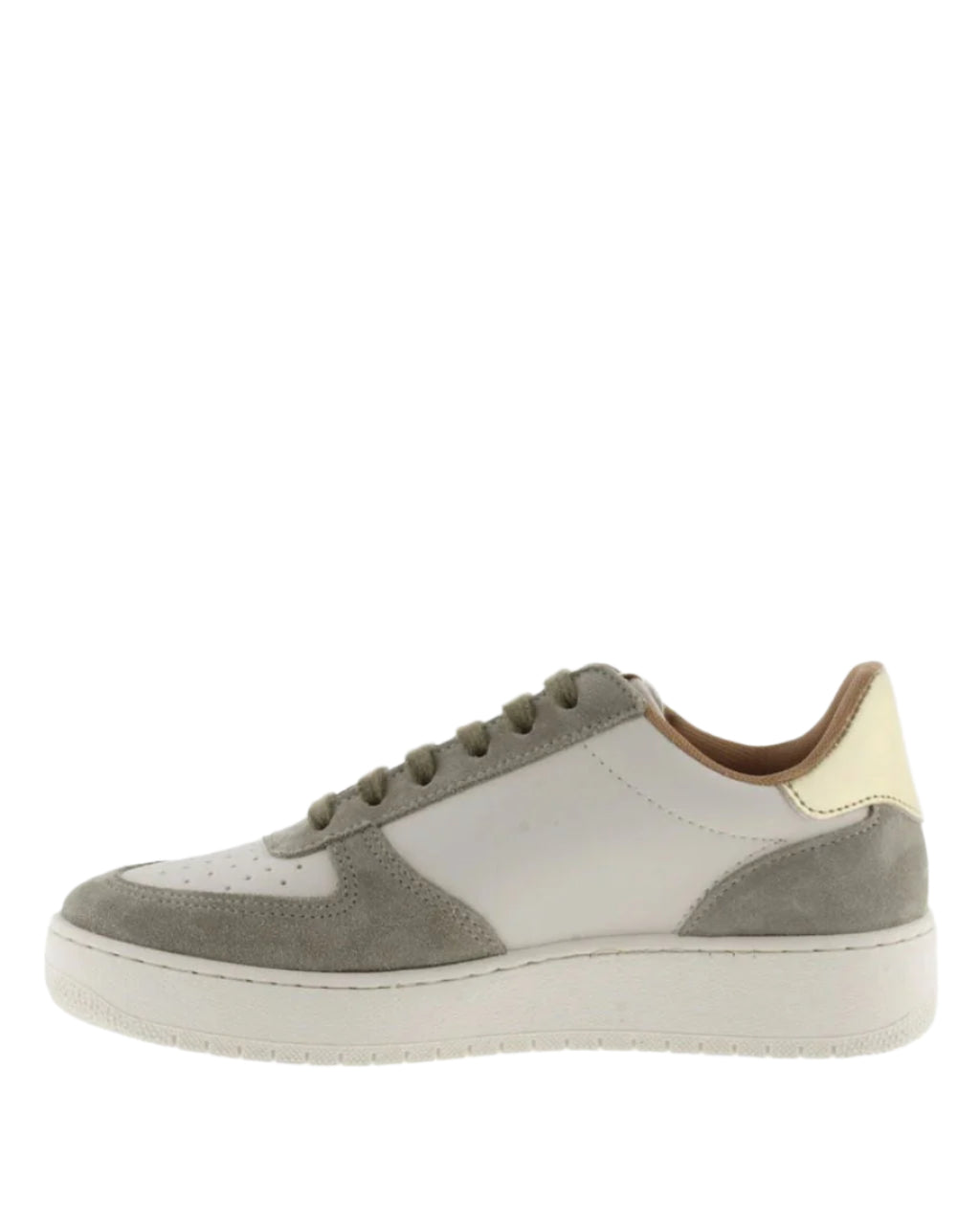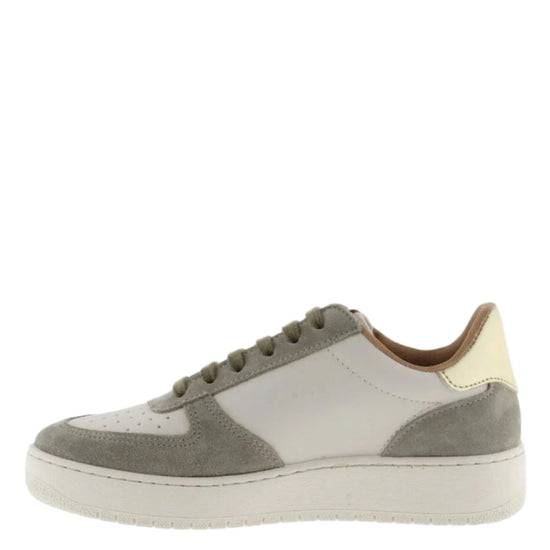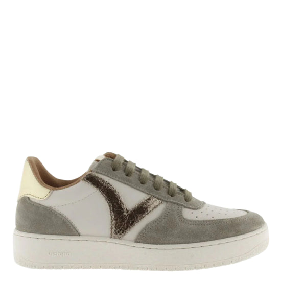 Women's trainers made in faux leather with split leather panels to match the laces and lining, made in Spain. Cracked effect V on the side and golden metallic detail on the back and on the label on the tongue. Perforated upper for improved breathability. The sole is 3 cm and is made with vegetable oils rather than mineral oils, reducing our environmental impact. Outstandingly comfy and lightweight.