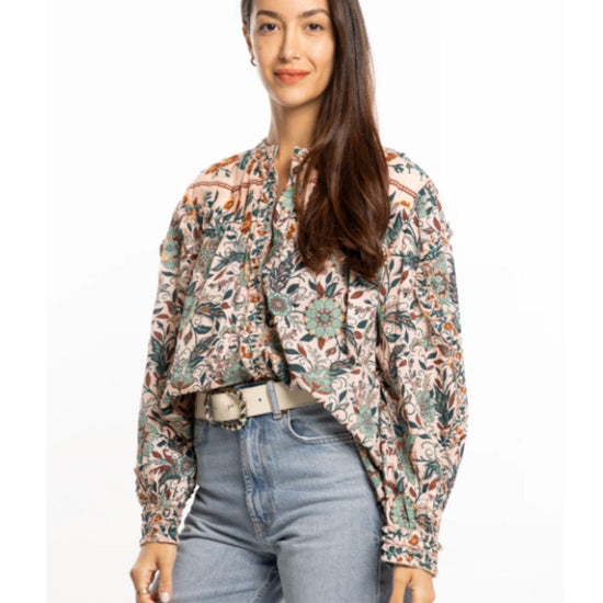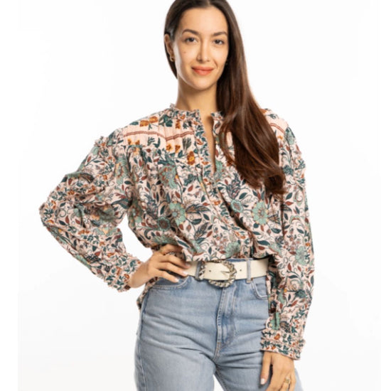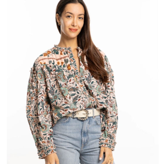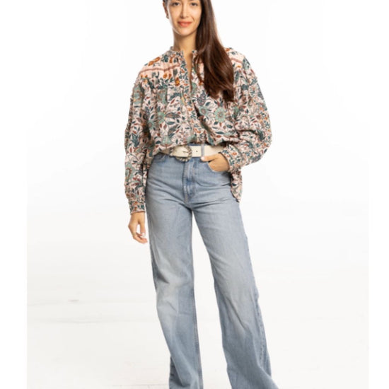 The Mariana Blouse in Crystal Print is a chic autumn essential, woven in pure cotton in a rich, fall-inspired palette. Featuring elegant long puff sleeves, a pleated V-neckline, and delicate frill detailing, it blends feminine charm with everyday versatility. Perfect for pairing with jeans, tailored pants, or skirts, this blouse transitions effortlessly from daytime outings to evening gatherings throughout the season.