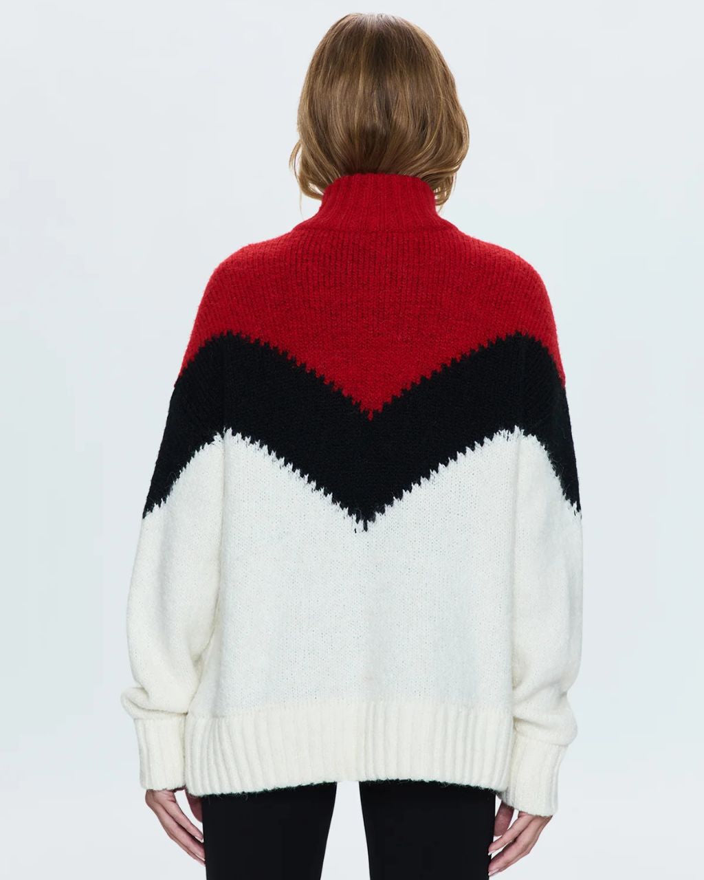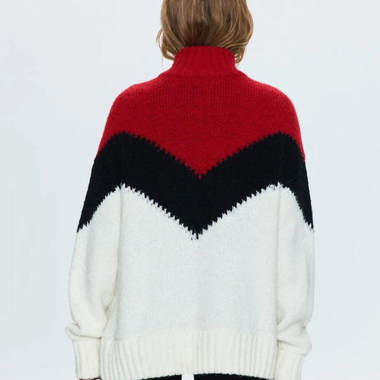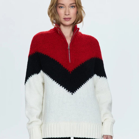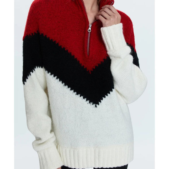 Medium weight pullover sweater with a relaxed pullover fit. With a quarter zip neckline and high sport collar. Lofty ribbing at cuffs and hem. Offered in a multi-colored red and black chevron motif over a cream white base hue.