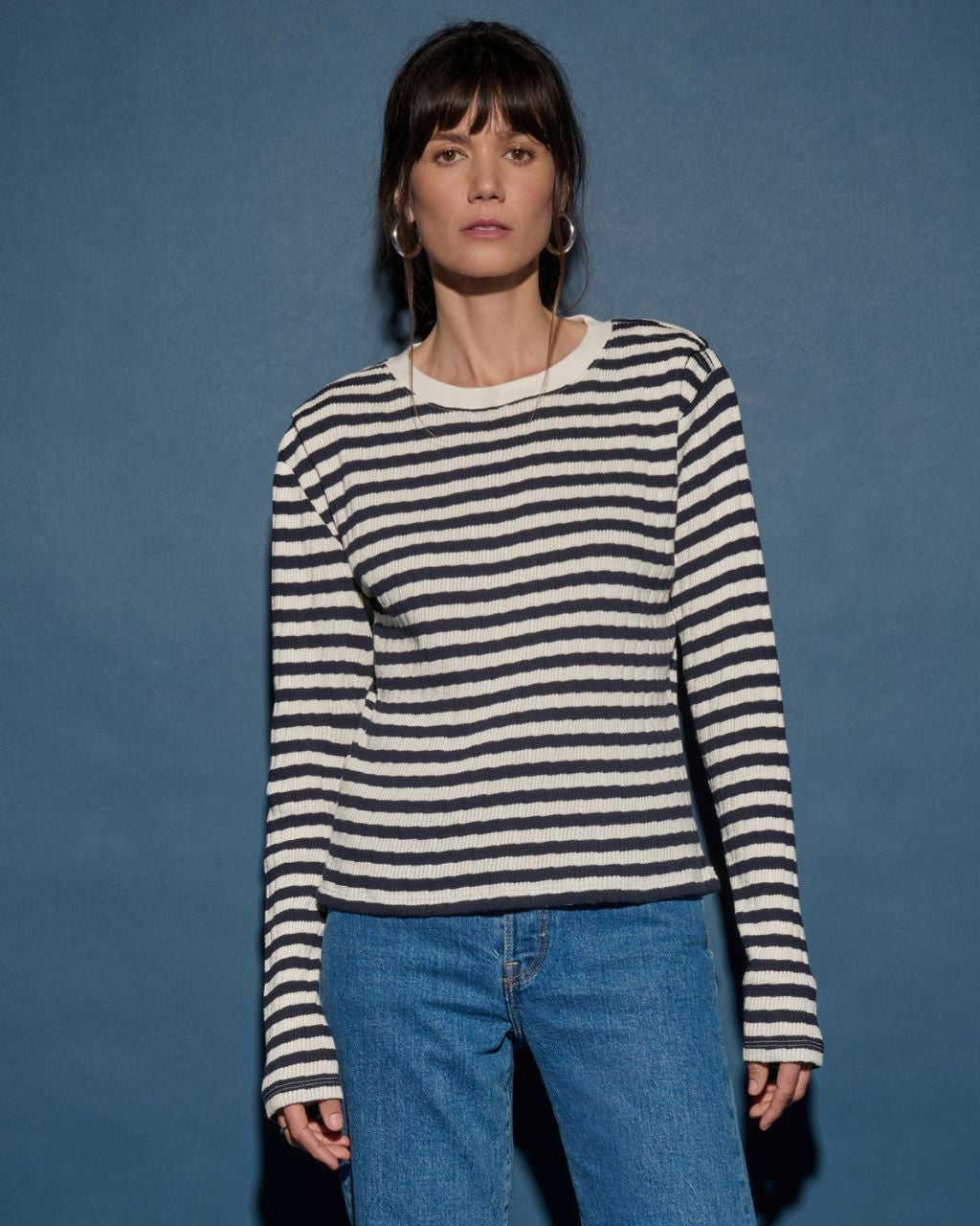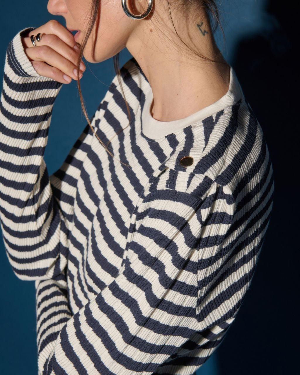 Crew neckline, long sleeves, and a little buttoned shoulder action (because it wouldn’t be ours without the signature gold snaps, of course). (This one comes in Navy and White Pointelle Stripe.)