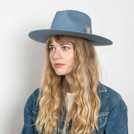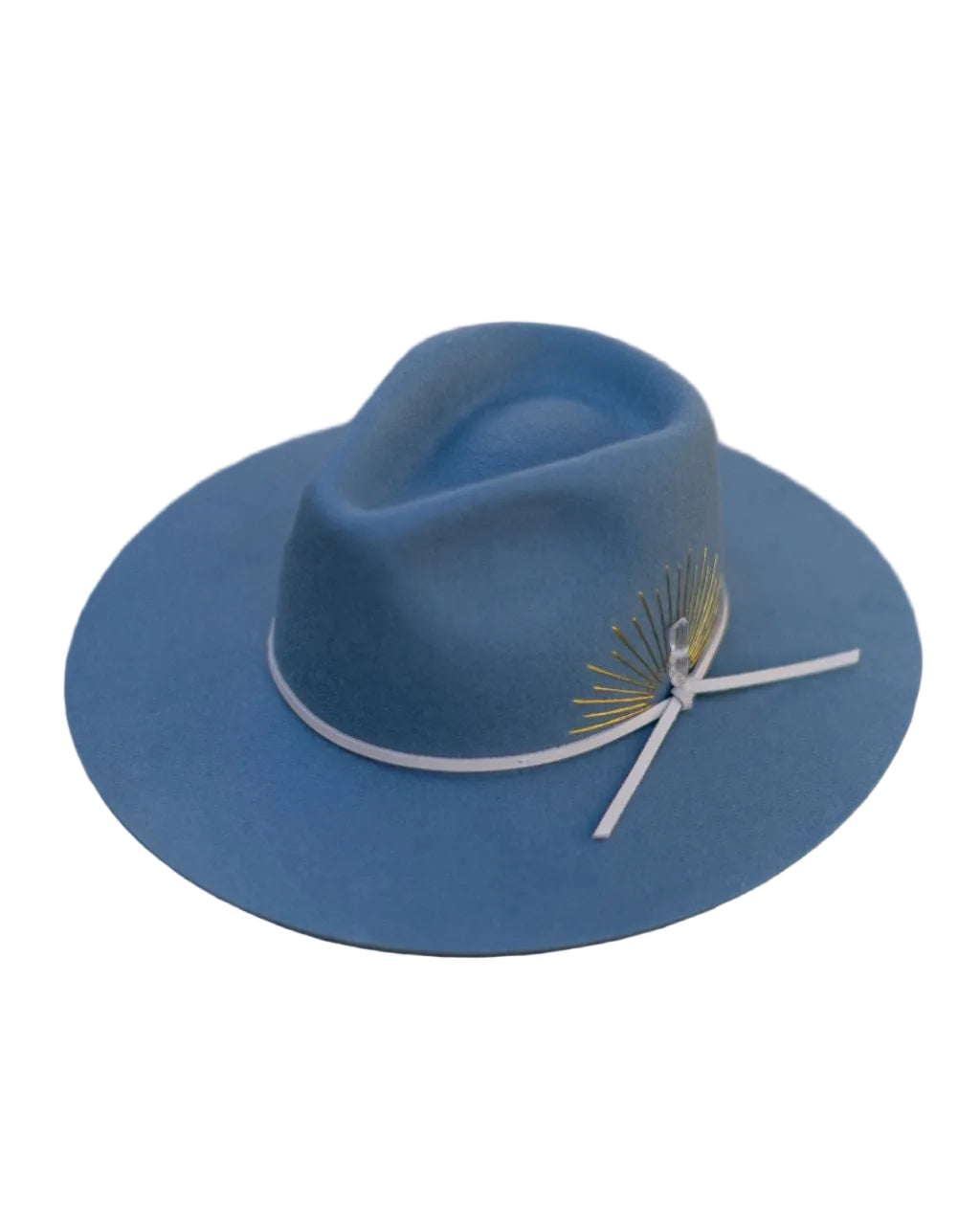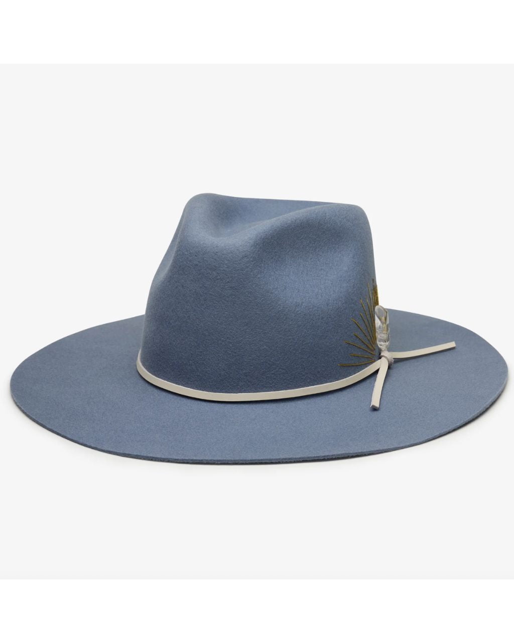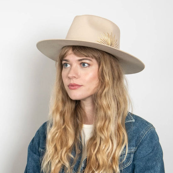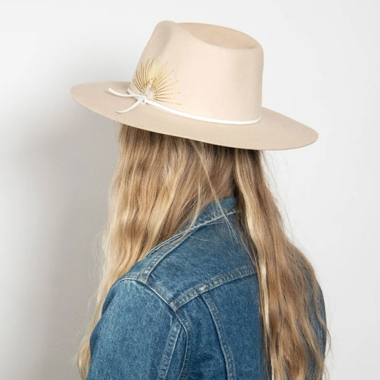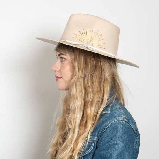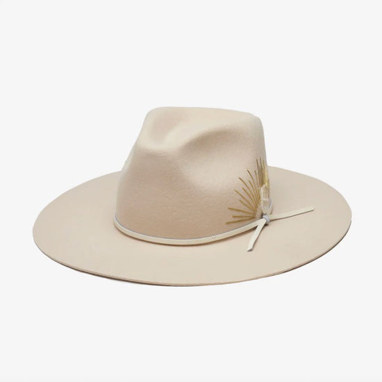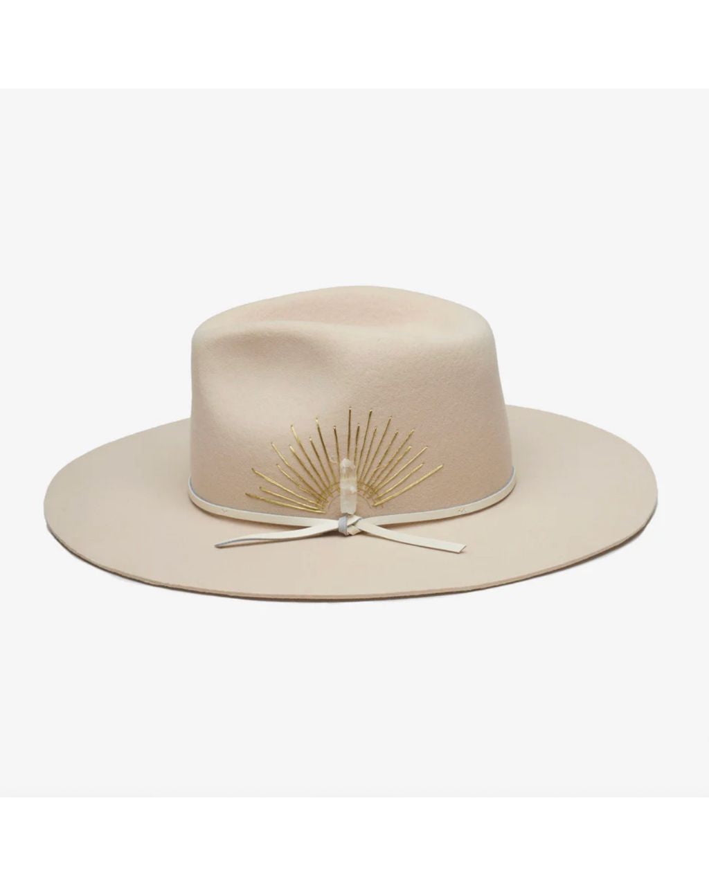 Could this hat be any more dreamy? Made with Australian cashmere wool, this flat brim rancher is hand-stitched with sun embroidery, and accented with a genuine leather tie band and Selenite crystal. Swoon.