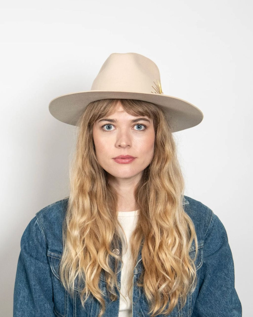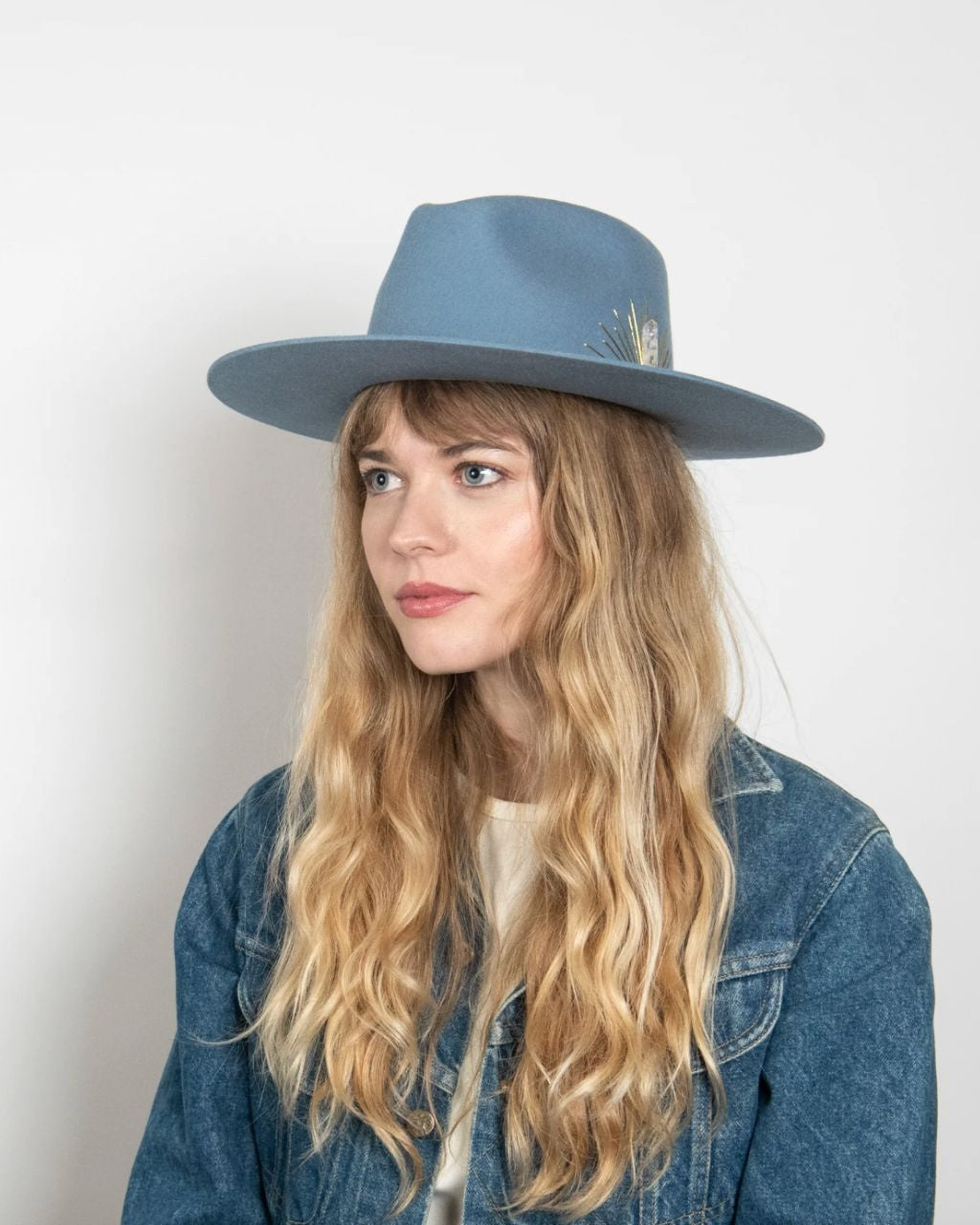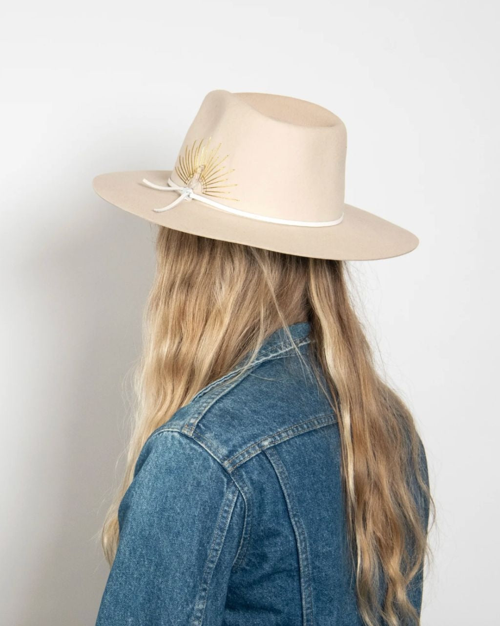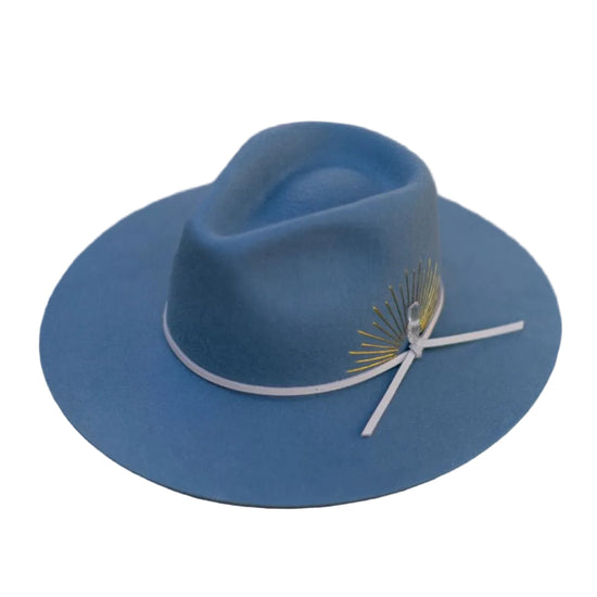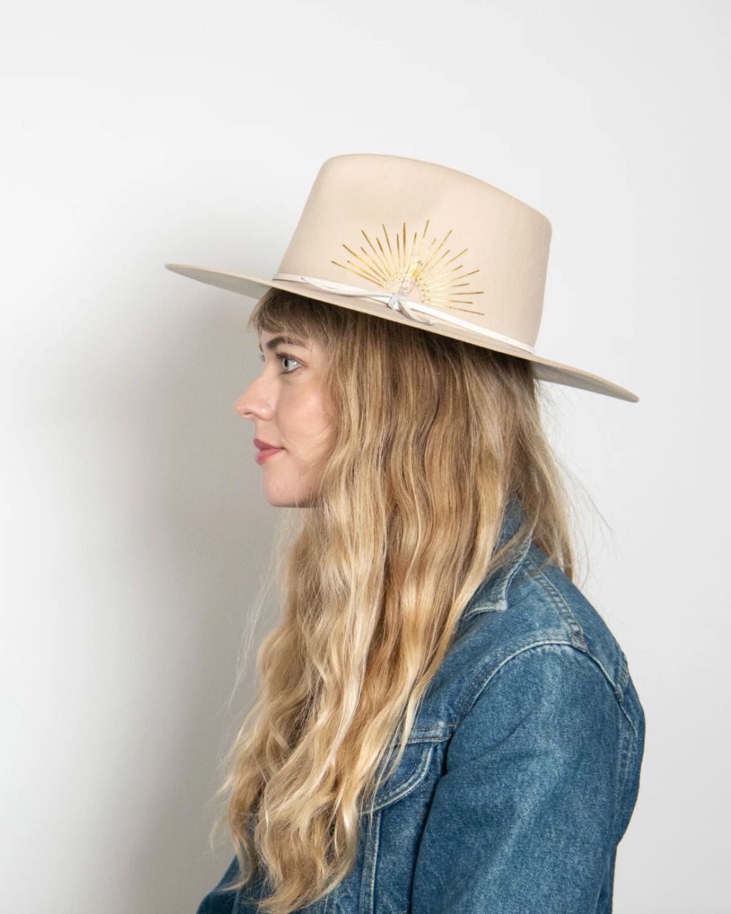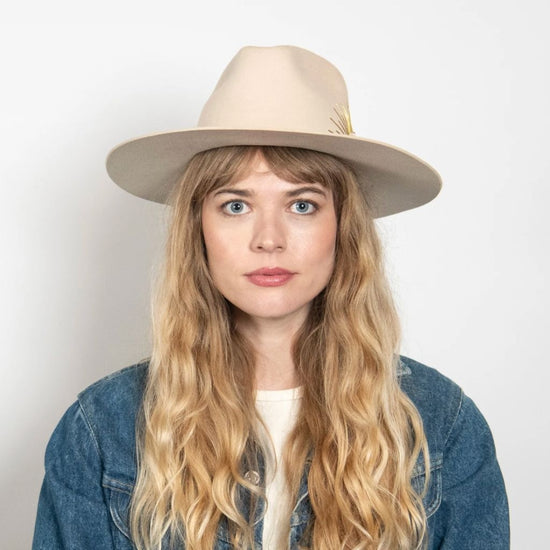 Could this hat be any more dreamy? Made with Australian cashmere wool, this flat brim rancher is hand-stitched with sun embroidery, and accented with a genuine leather tie band and Selenite crystal. Swoon.