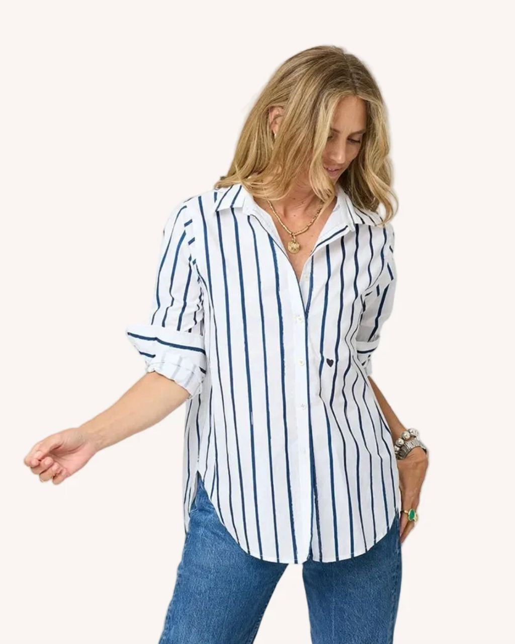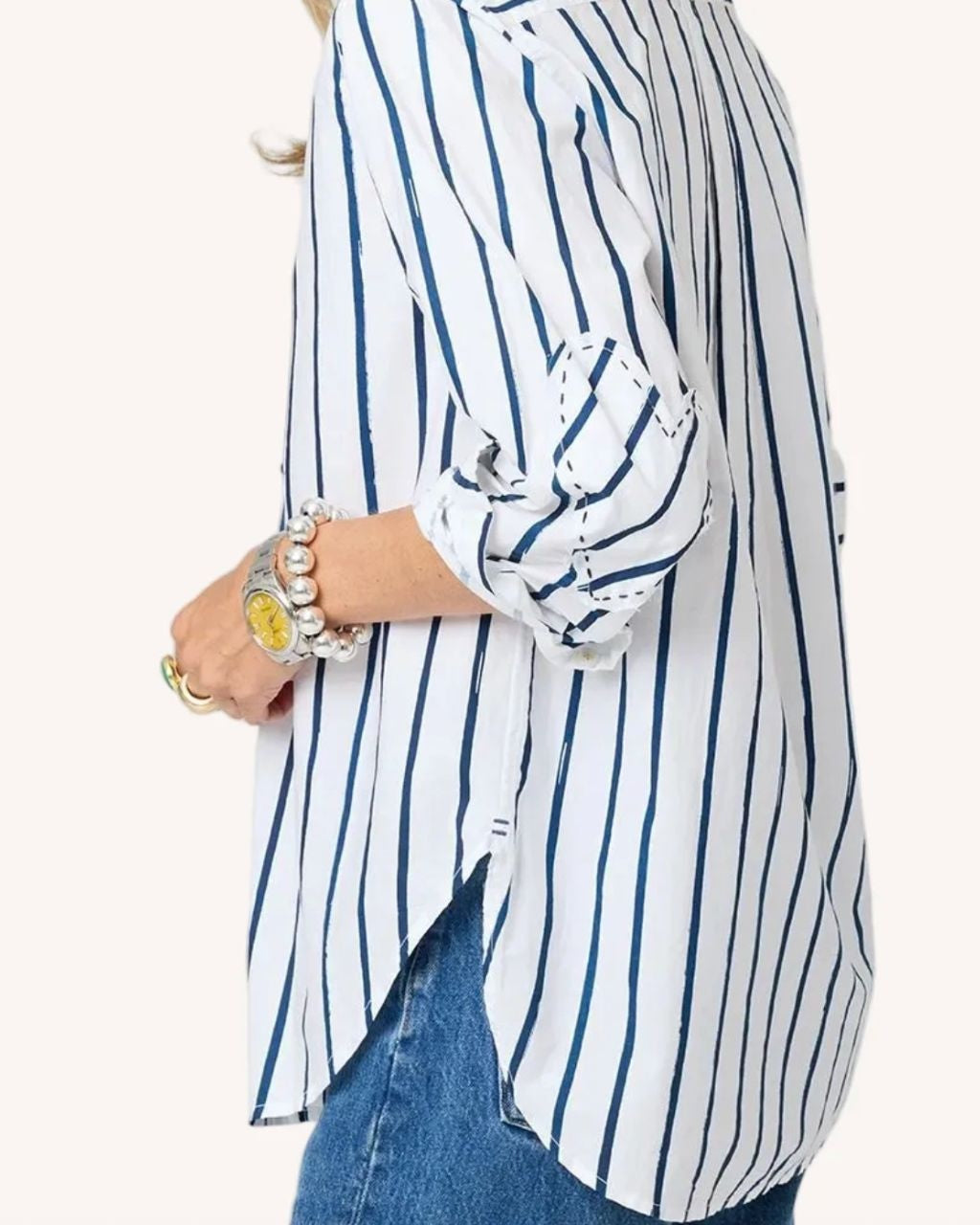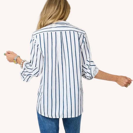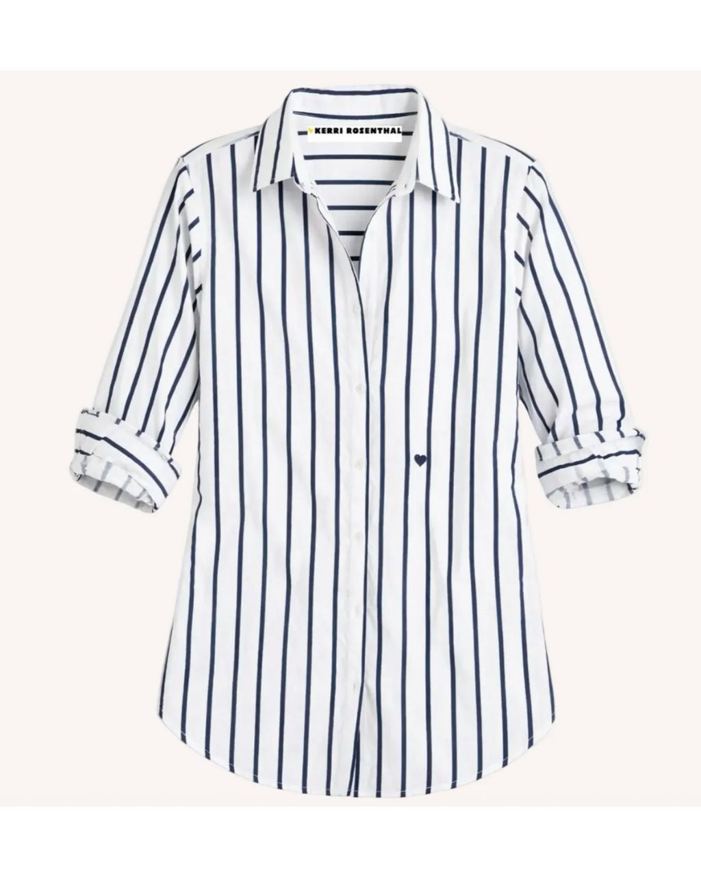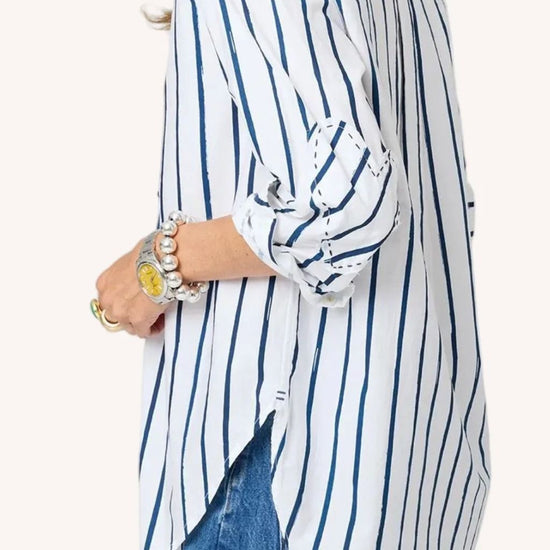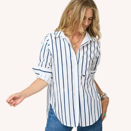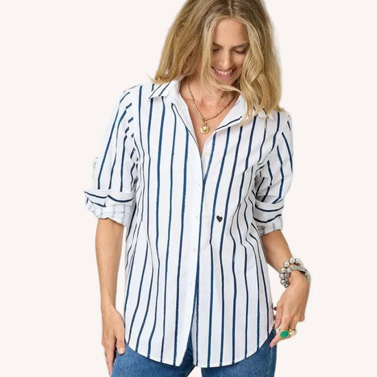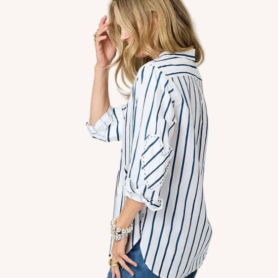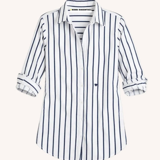 Our Mia shirt in a soft cotton poplin with Kerri's Mr. Sharpie artwork striping. Tonal elbow patches make this a work of heart. Wear daily with jeans and style with a KR Blazer to finish. This is classic with an artful twist!
