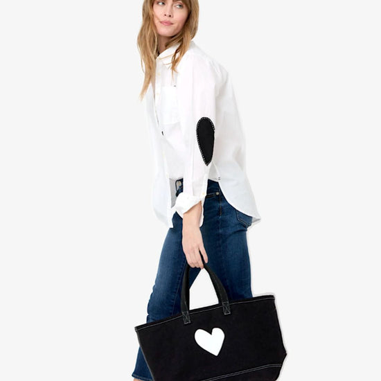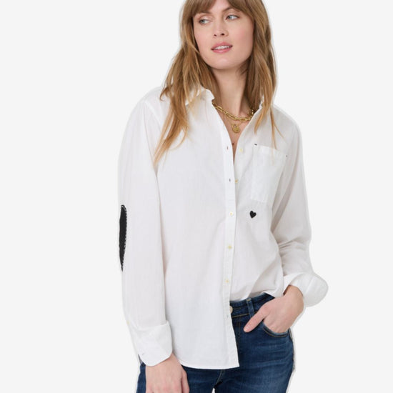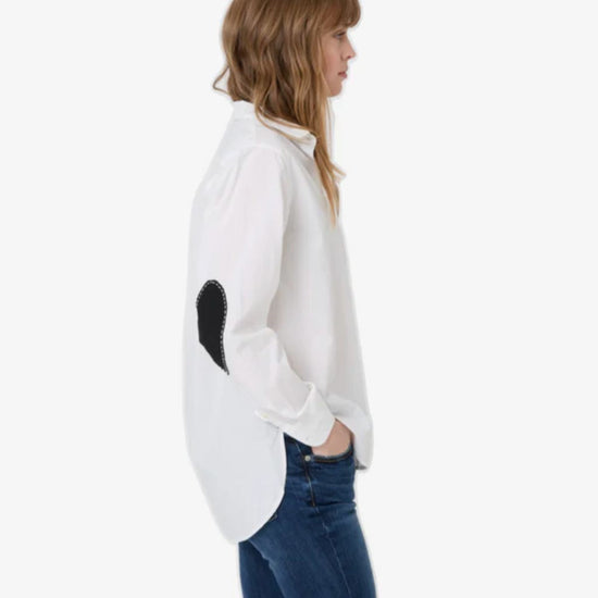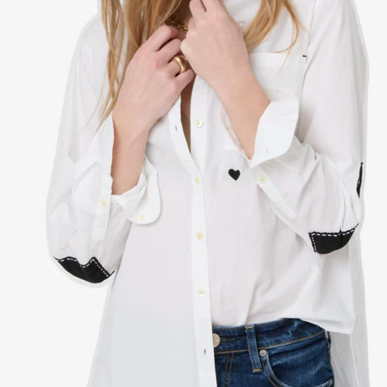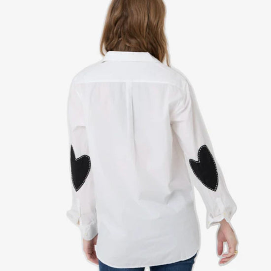 Your favorite Mia Shirt back as the perfect wardrobe staple. This white long sleeve button shirt is equipped with Kerri's signature stitched heart elbow patch sleeves and loved on the back of the neck. Our signature heart patch elbows long sleeve button-up shirt is part of our essential collection.