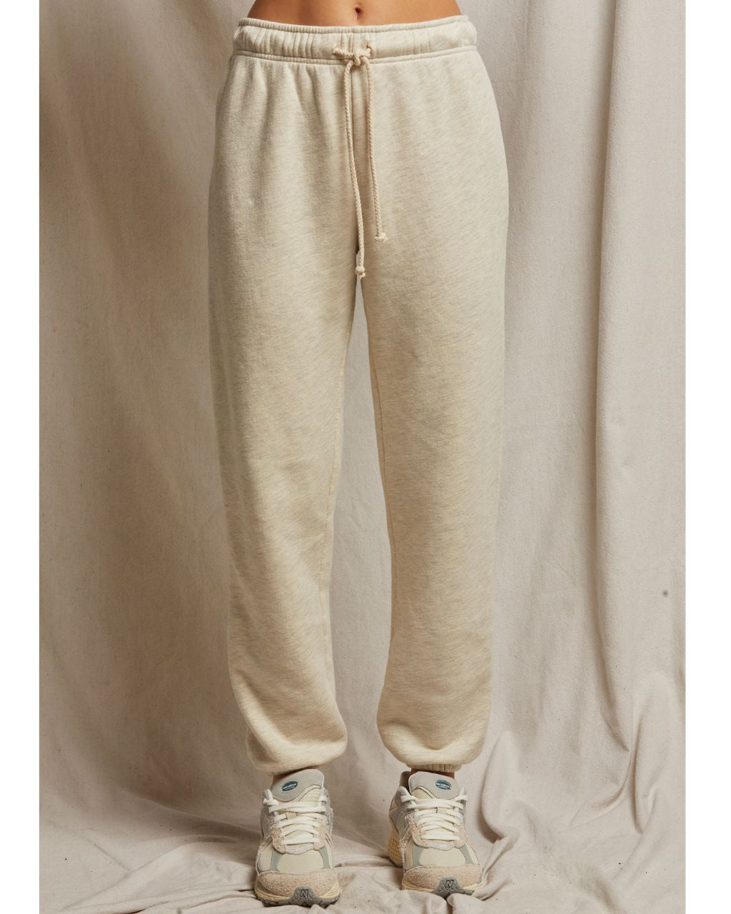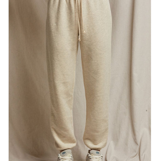 features: 100% cotton fleece; natural braided draw cord with wide hidden waistband
