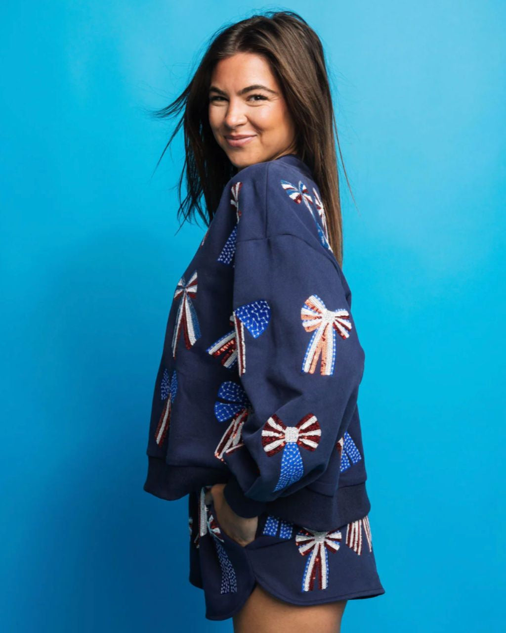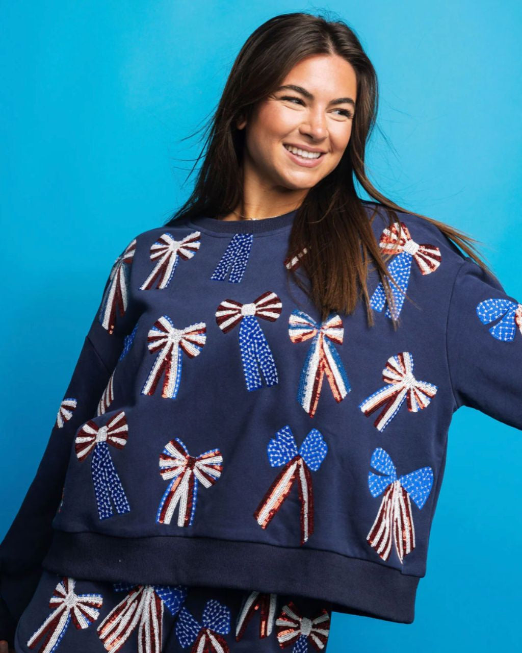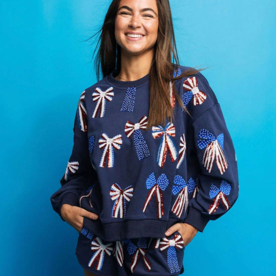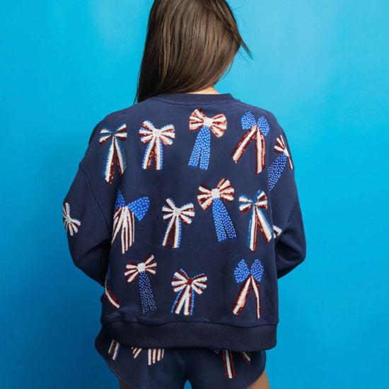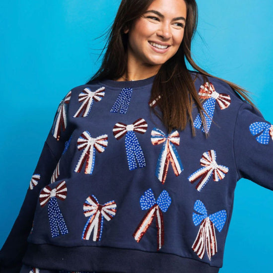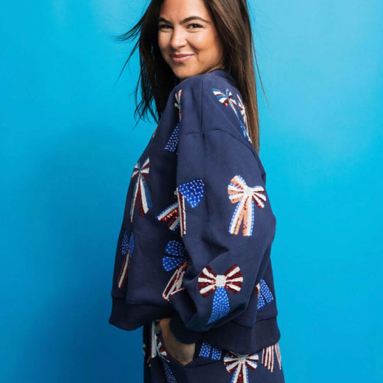 Show off your patriotic spirit with this playful navy, red, white and blue bow sweatshirt. Featuring a unique combination of stars, stripes, and bows, this sweatshirt is the perfect addition to any Memorial Day or 4th of July celebration.
