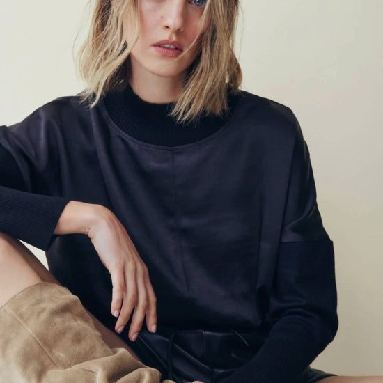 An elevated mock turtleneck. Cotton rib at the neck and sleeves, satin feel on front and back. Hi-low detail on bottom hem.