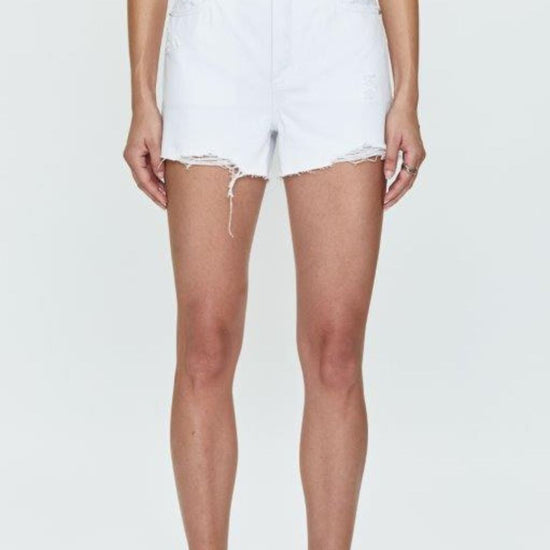 High-rise denim short with a relaxed silhouette, in a medium length crafted from rigid non-stretch denim to hold its shape. Offered in clean white colored denim, accented by contrast hardware and medium distressing notes throughout.
