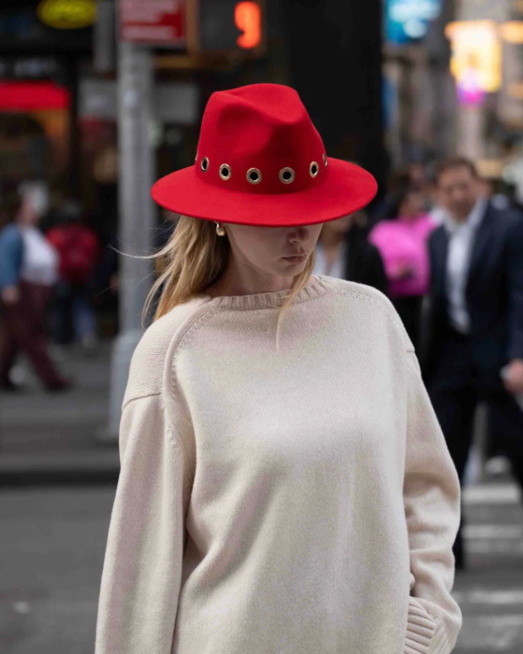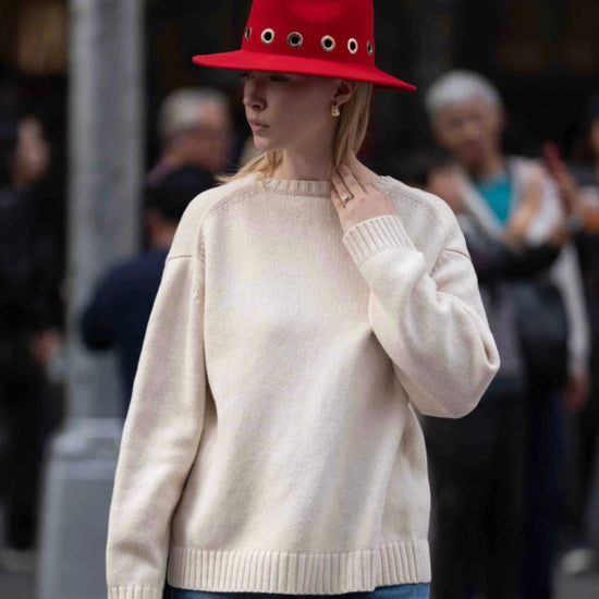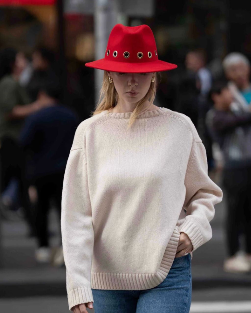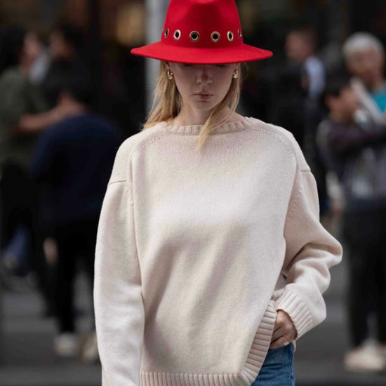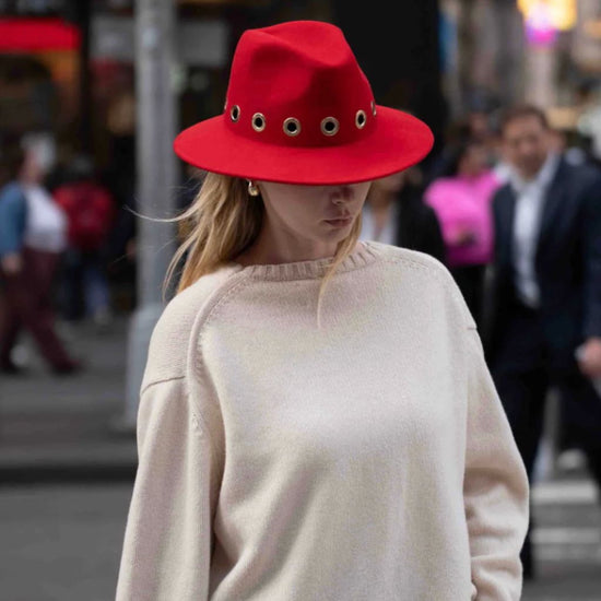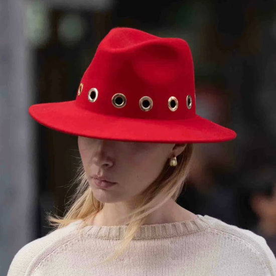 The iconic fedora hat is re-imagined in chic red felted wool with gold grommet detail. Made in Italy, this special piece will keep you warm and fashionable for seasons to come.