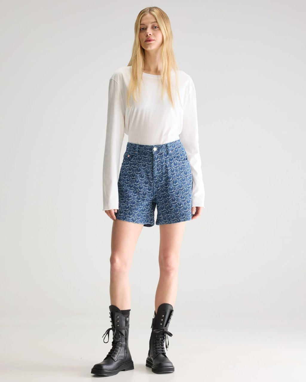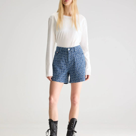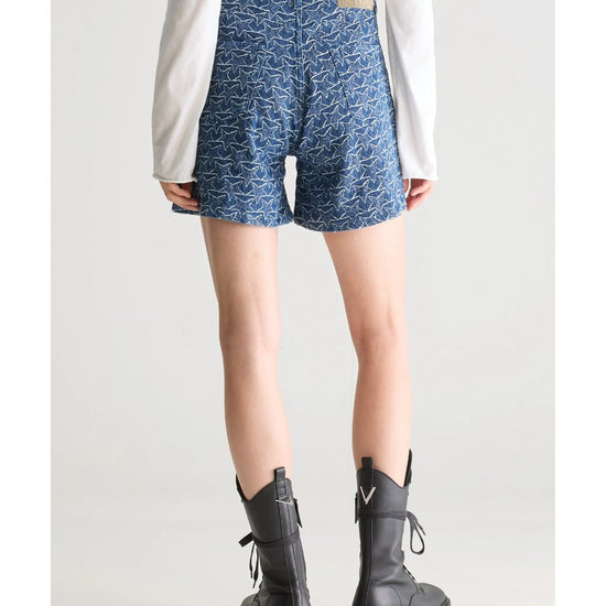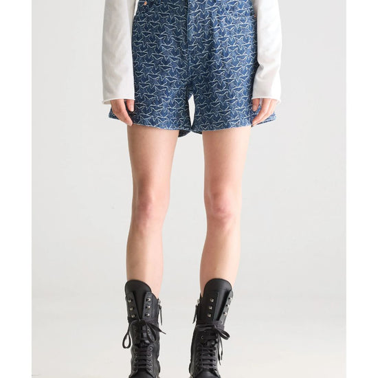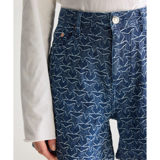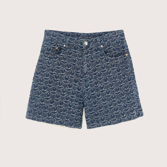 Boyfriend shorts with a longer silhouette and wide legs, in a navy blue denim fabric with a white star pattern.
