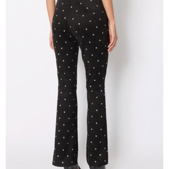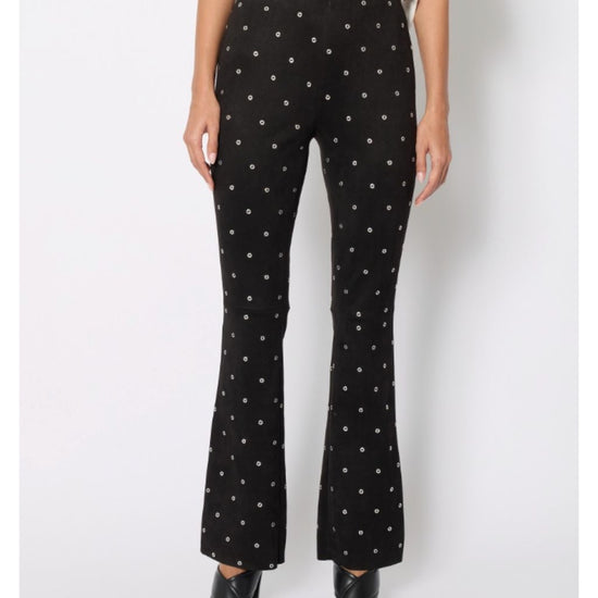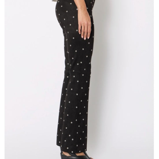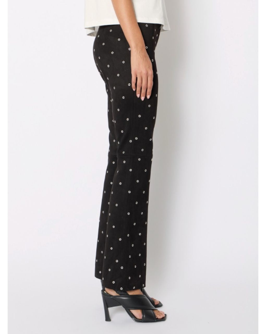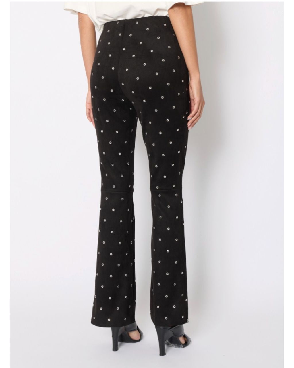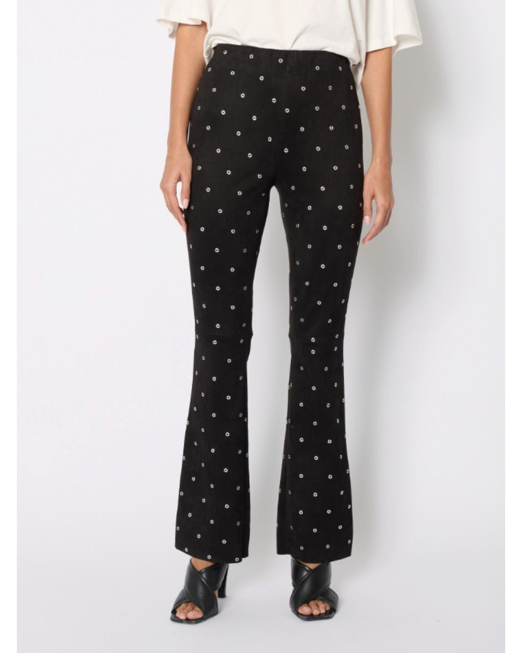 The POLINDA trousers combine comfort and style with their soft suede fabric and elastic waist for a perfect fit. The silver rivets placed all over add a rock and modern touch to this easy-to-wear model. Ideal for a bold and trendy look, to pair with a basic t-shirt or a leather jacket.