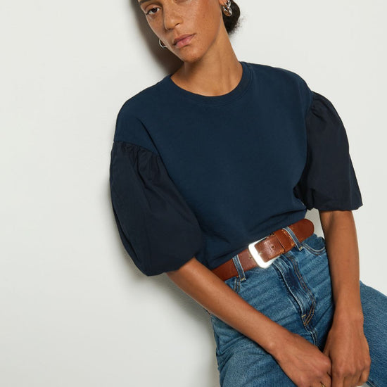 Casual, but make it chic. Crew neckline with contrast ribbing, drop shoulders, and contrast poplin balloon sleeves for all the impact with none of the fuss. This one comes in Night Sky.