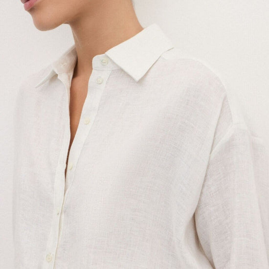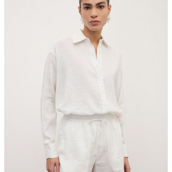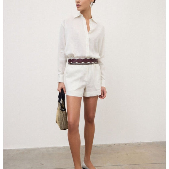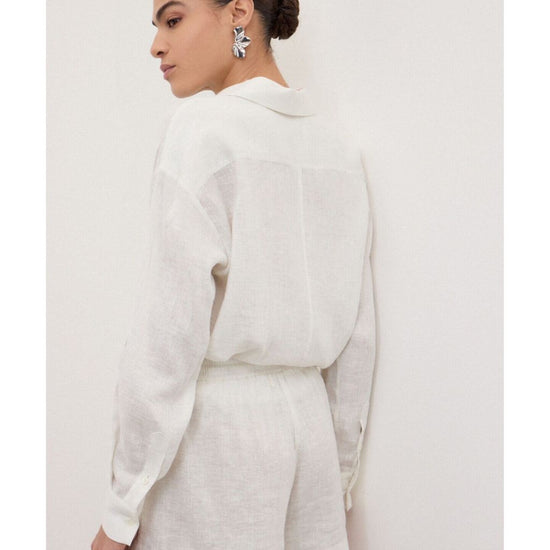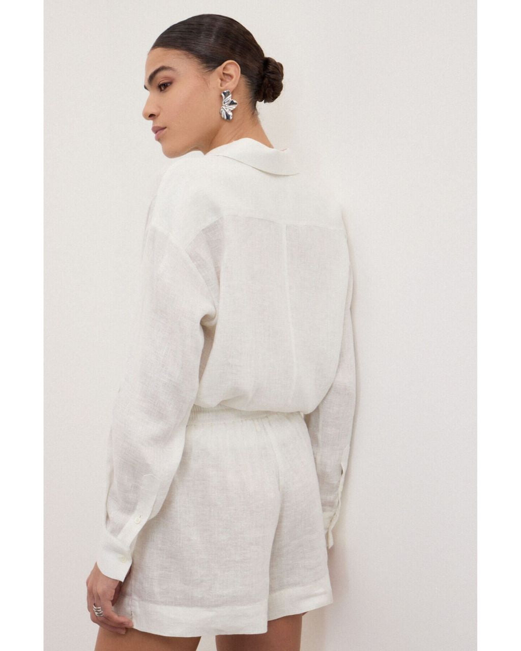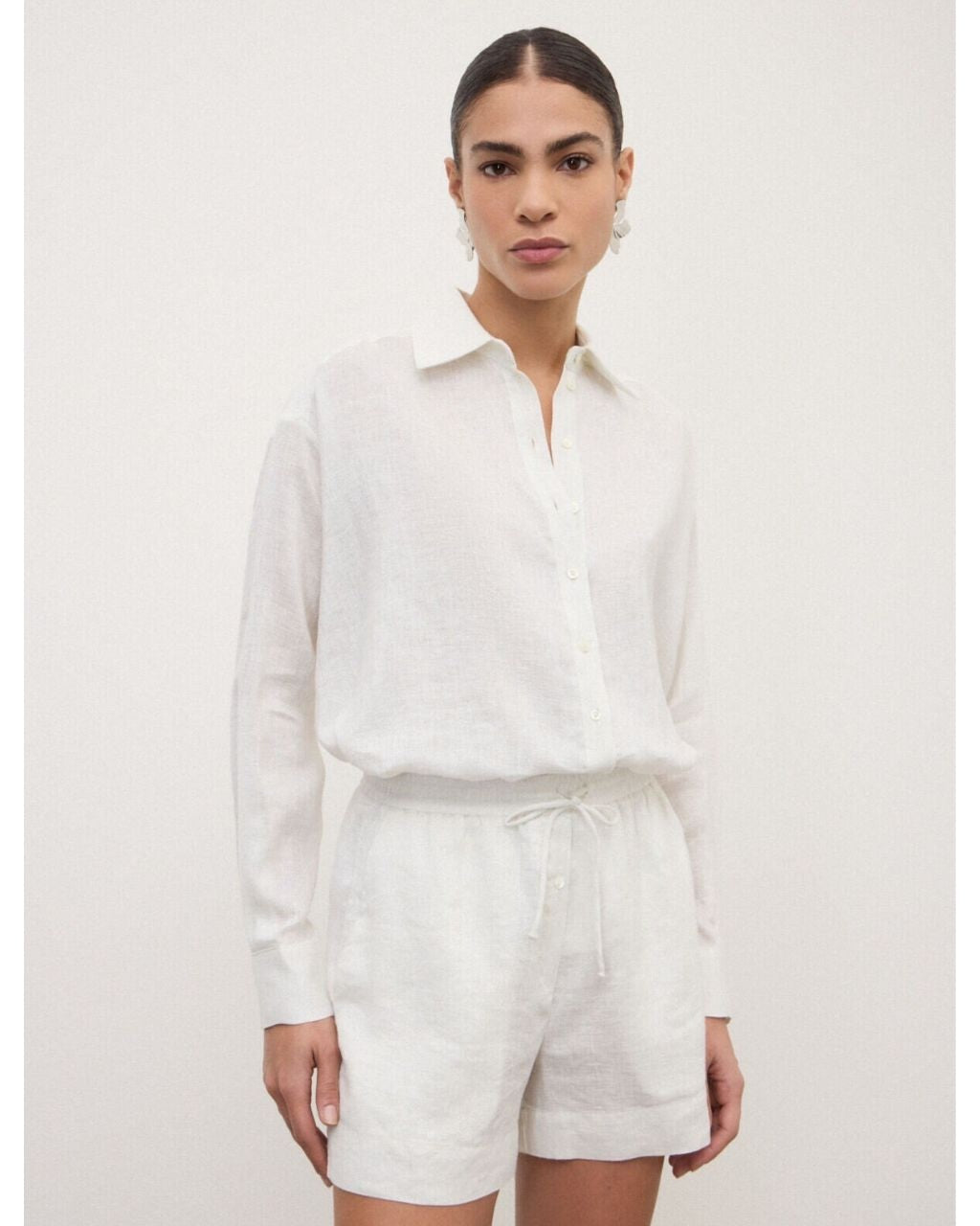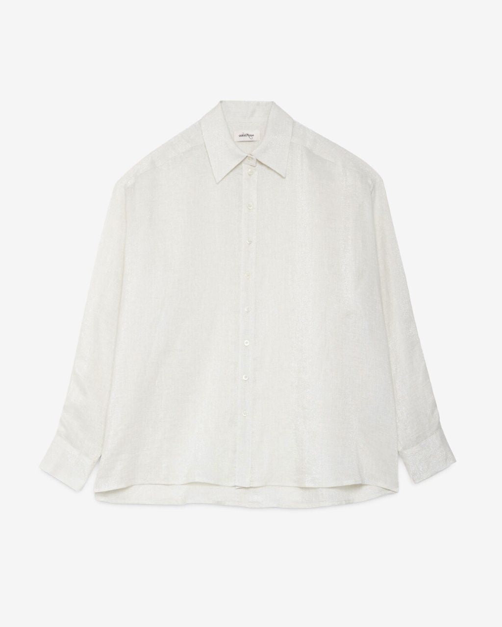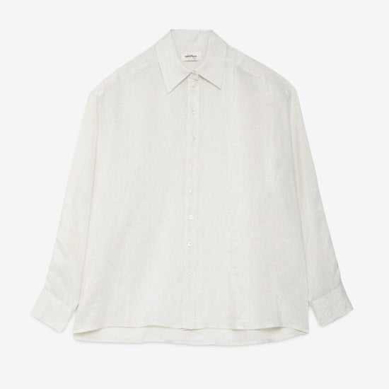 Oversized shirt made of linen with a textured white base and silver lurex yarn, which gives the piece a delicate shimmer. The loose, relaxed fit is designed for comfort and lightness, while maintaining a natural elegance. Perfect as a top or worn open, for fresh and refined summer looks.