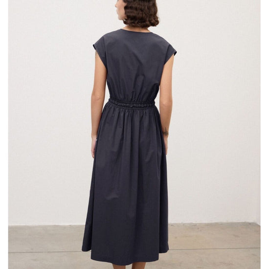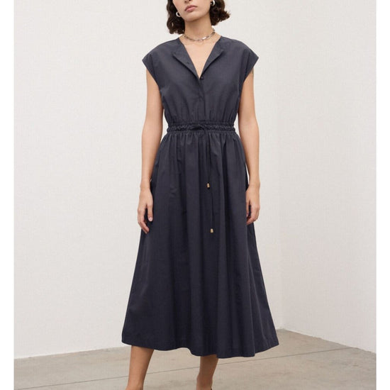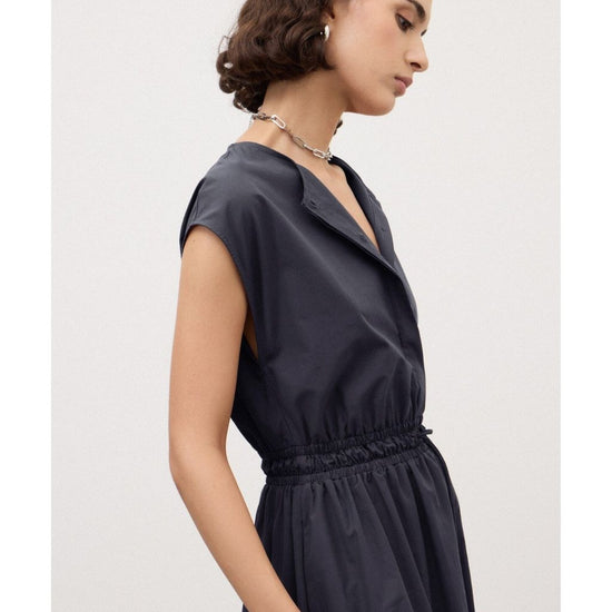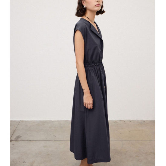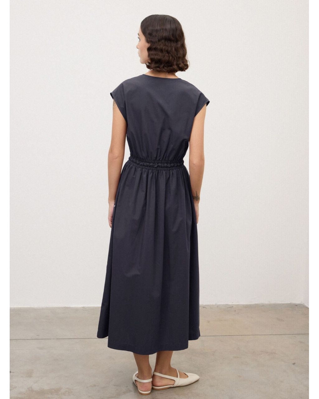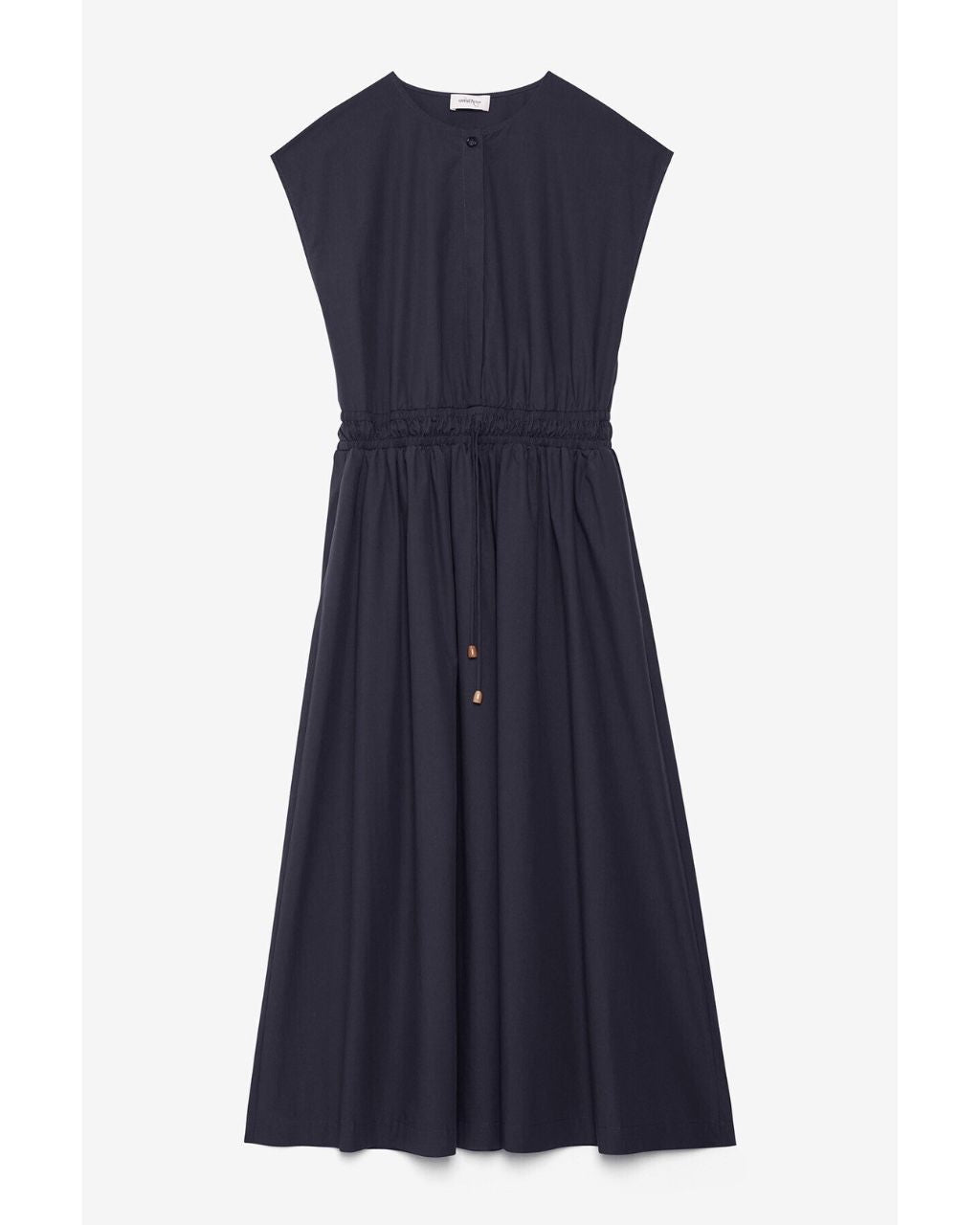 Long sleeveless poplin dress with a V-neck, front button closure, and adjustable drawstring waist. The full skirt balances the bust line, defining a feminine and contemporary silhouette.