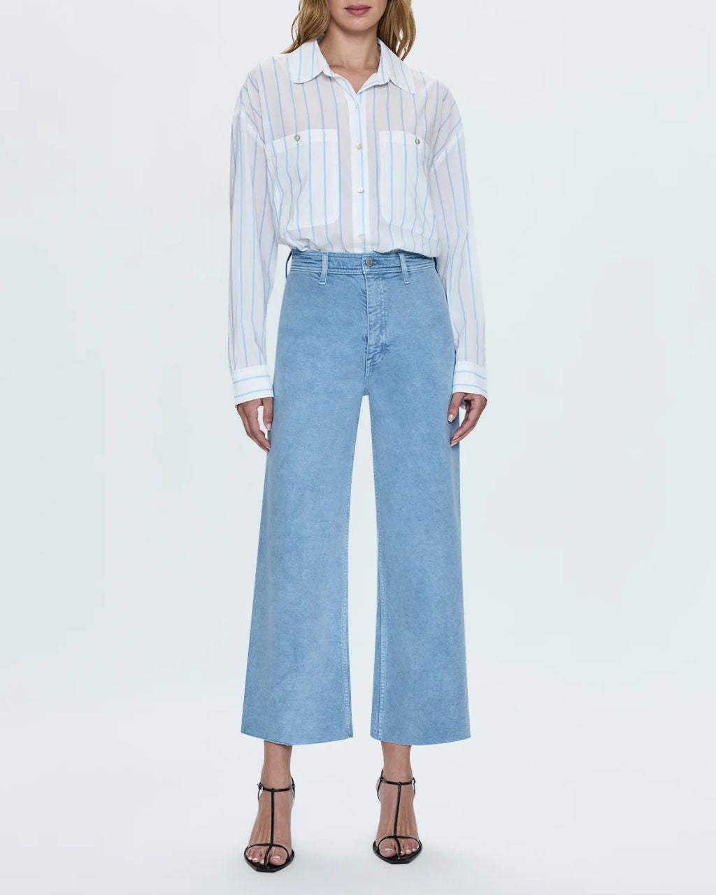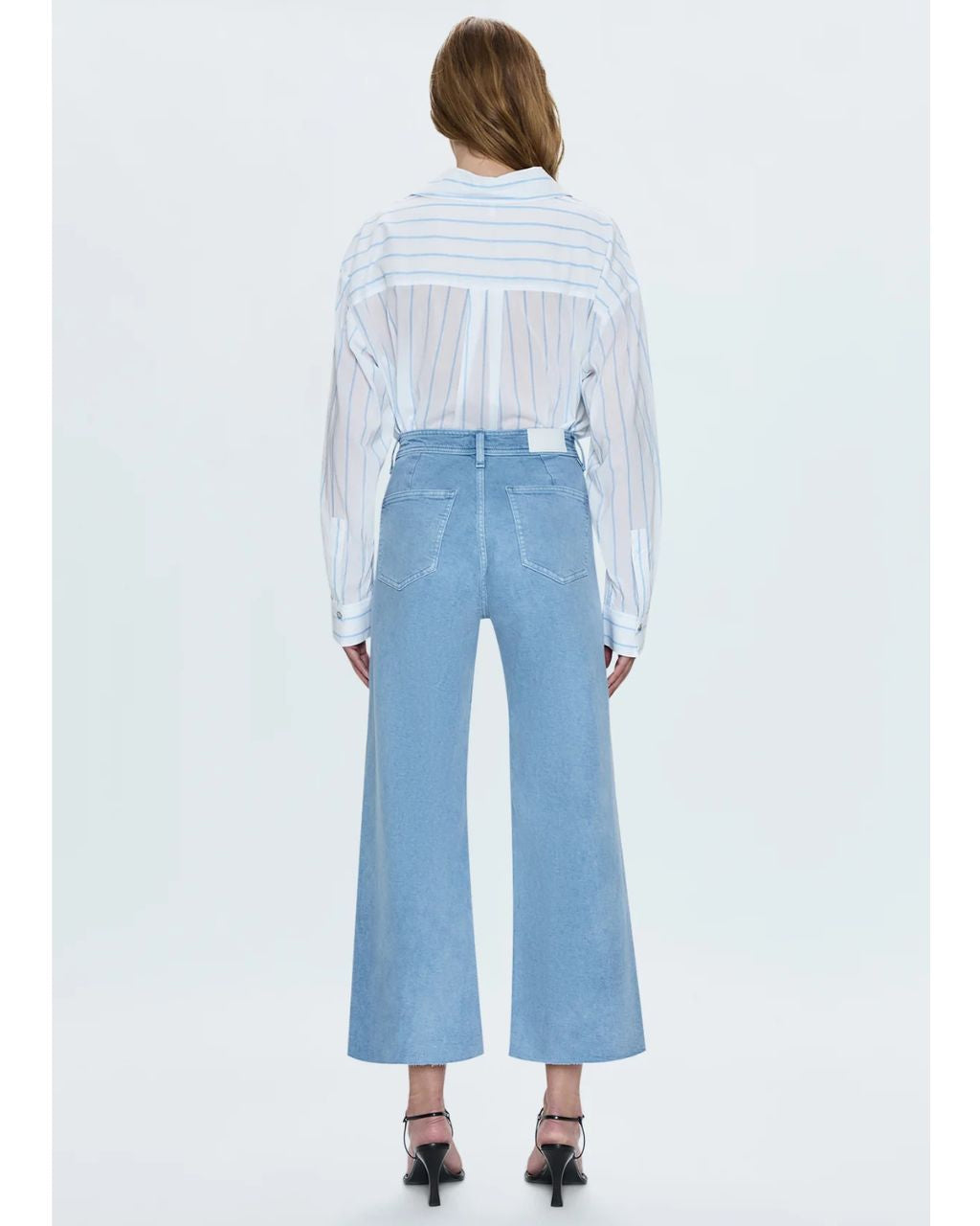 High rise waist, with a wide leg silhouette and a cropped, ankle length hemline. Crafted from our signature comfort stretch denim, with a double stitched waistline and scissor cut hems.